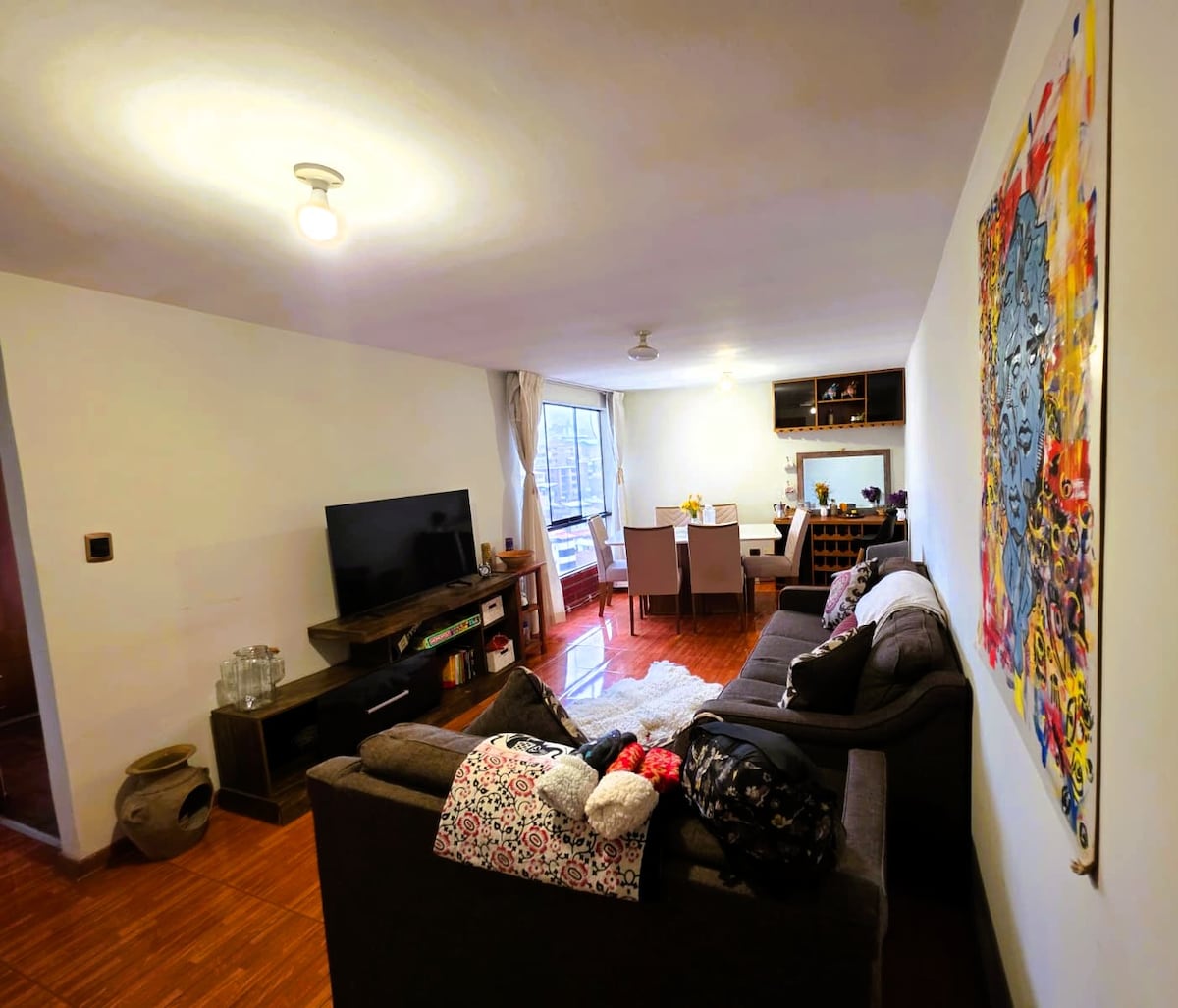 Disfrute su estadía en Cusco al máximo en este espacioso y lujoso departamento. Cuenta con espacios amplios, para grupos de hasta 6 personas. Ofrecemos 3 habitaciones y 2 baños, y todas las comodidades como 1 Smart Tv en la habitación principal y 1 Tv Smart Grande en la sala, todos con claro tv y Netflix gratis, balcón con una hermosa vista, lavatorio, super ducha española con agua caliente, cocina estilo americano totalmente equipada con todos los artefactos necesarios y un amplio garaje.