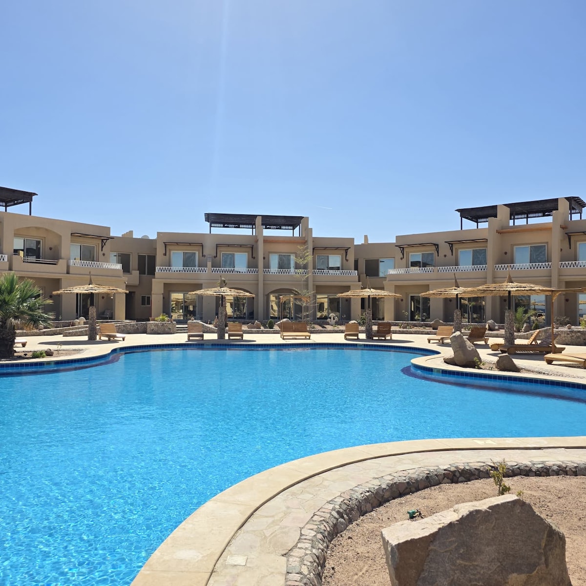 Forget your worries in our spacious serene space. Huge stylish apartments in a small secure complex. Just steps from Assalah beach's beautiful fish and corals. 6 apartments, each unique, with their own private outdoor spaces and a large shared pool. Also same name on line. Plus luxurious rooftop space with a hot tub, bbq, covered seating areas and stunning views to the mountains and the sea of Aquaba. Everything you need is close by but Redrock is your oasis in the Sinai desert.