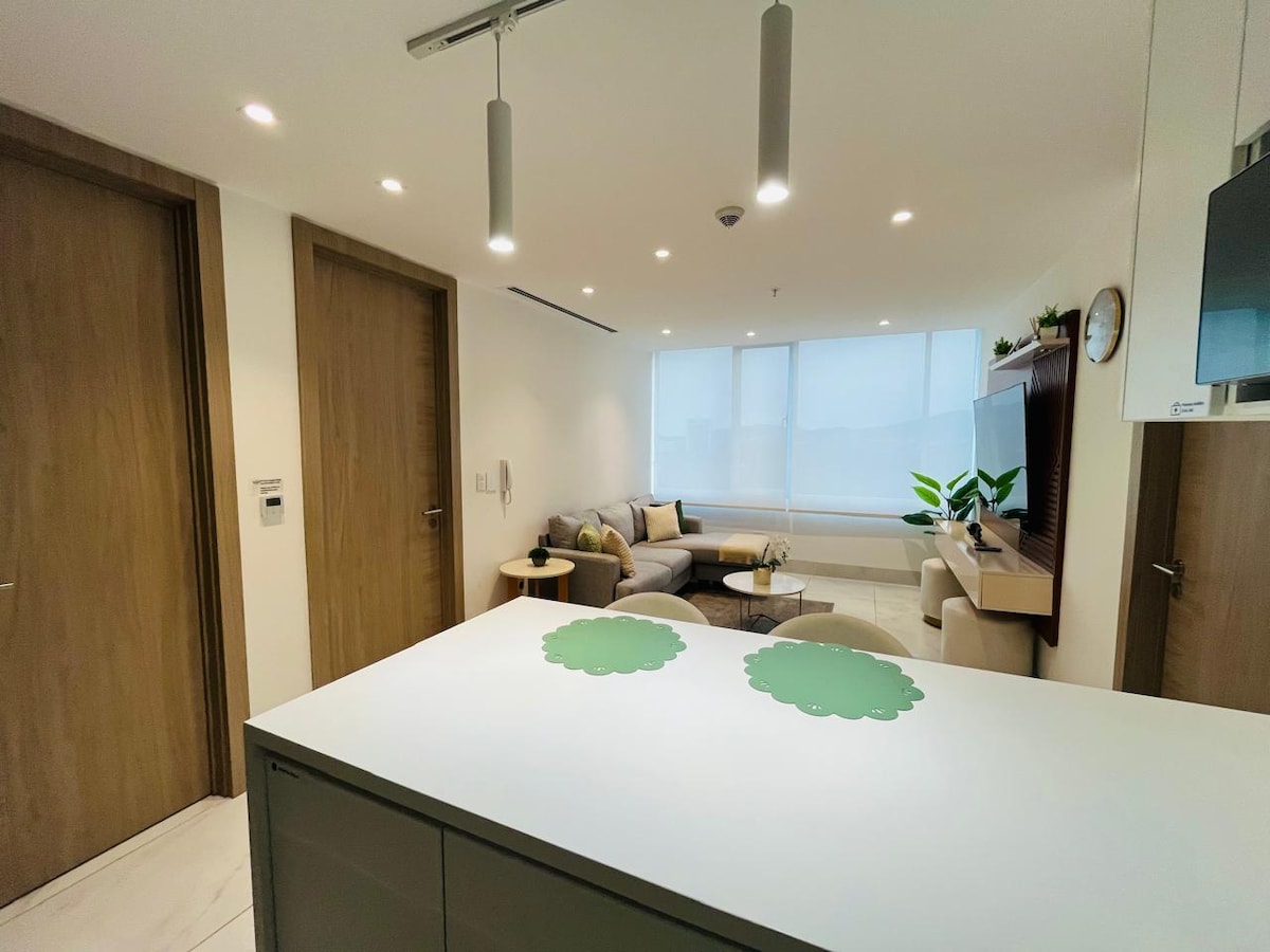 Si buscas un espacio que combine la comodidad de un hogar con la estética de una revista, has llegado al lugar correcto. Este departamento de 2 habitaciones es el escape perfecto para viajes de negocios, parejas o familias pequeñas que desean disfrutar de una estancia ultra moderna y excepcionalmente equipada. Ingreso por medio de cerradura inteligente. Habitaciones con camas tipo full. Baño completo. Sala-comedor amplia, Smart TV de 50”. (Netflix - Youtube) Internet (wifi de alta velocidad)