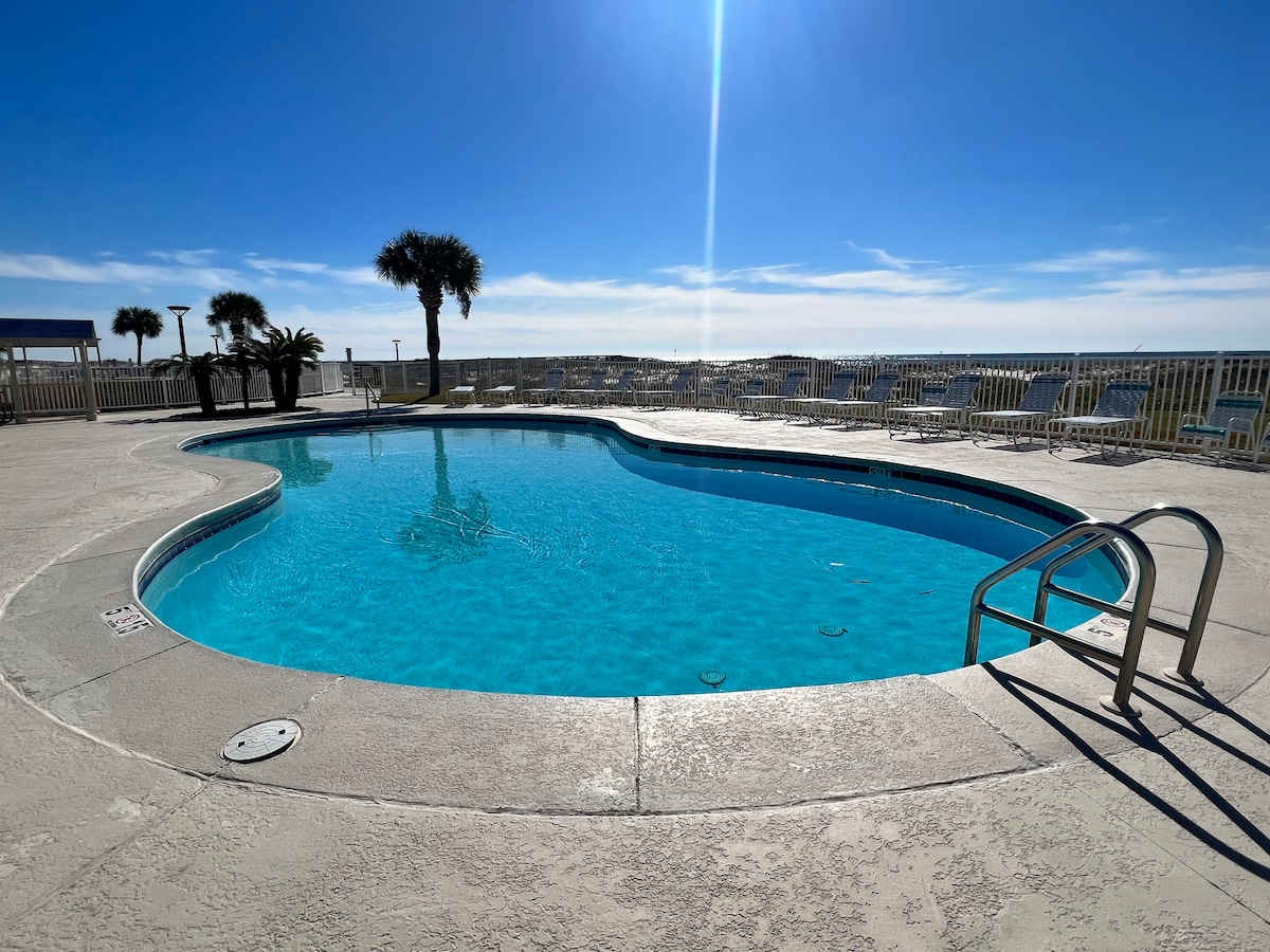 ¡Refúgiate en este hermoso apartamento de 1 dormitorio/1 baño FRENTE A LA PLAYA ubicado en el hermoso Gulf Shores Plantation Resort a pocos pasos del Golfo de México! Situado en la parte más tranquila y aislada de Fort Morgan/Gulf Shores, pero lo suficientemente cerca de todo lo que necesitas en 20 minutos. Te encantará todo lo relacionado con este apartamento, desde la divertida decoración playera hasta los sonidos de las olas del océano mientras estás sentado en el balcón del piso superior (el 3.º). MÁXIMO 4 huéspedes, pero idealmente perfecto para parejas o familias pequeñas.