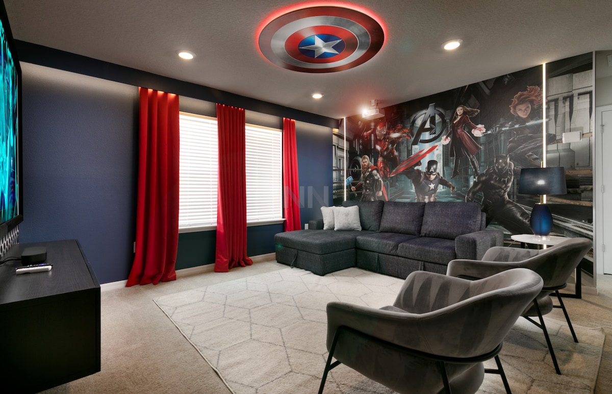 ¡Alójate en Adventure te espera 2 en ChampionsGate para divertirte y relajarte! Disfruta de 2 teatros, 2 salas de juegos, dormitorios temáticos y piscina privada y spa. Además, accede a la casa club The Oasis y al parque acuático. ¡A solo 15-20 minutos de Disney! Teatro temático de 🎬 Harry Potter. 2 salas de juegos Super Mario. Sala de juegos Nemo. Televisores inteligentes. 🏊 Piscina/spa climatizado orientado al oeste (30 $/dia por calor). Muchos asientos con bar. Televisor de 55 pulgadas. Teatro junto a la piscina. 🛏️ 8 BR y 5 BA. 3 Bdrms temáticos: Avengers, Moana y Minions. Capacidad para 16 personas.