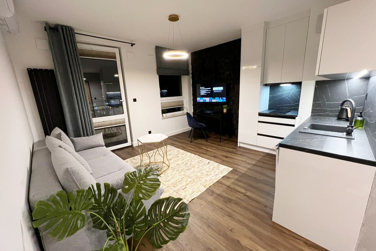 Komfortowy, w pełni wyposażony apartament w nowym budynku. Salon z otwartą kuchnią podzielony na część jadalną i wypoczynkową. W sypialni znajduje się duże łóżko i przestronna szafa. Jest także garderoba jako dodatkowe miejsce do przechowywania. W okolicy znajdują się sklepy, restauracje i kawiarnie Wyposażenie: klimatyzacja, ekspres, czajnik, żelazko, deska do prasowania, pralka Dojazd z Lotniska Chopina 20 min taxi 50 min komunikacja z Lotniska Modlin 50 min taxi 120 min komunikacja