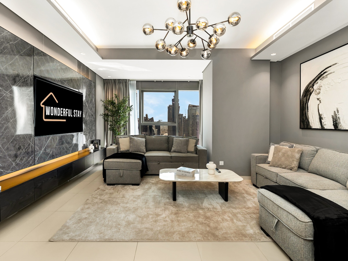 Trophy|Vistas al Burj con chimenea y ambiente de cine en casa