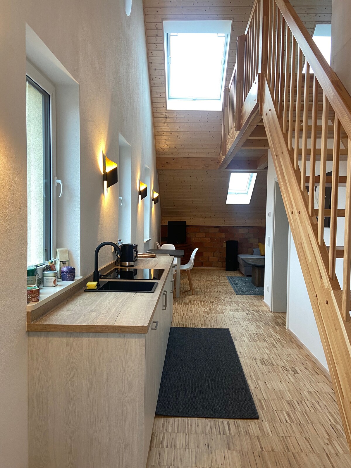En un antiguo establo de caballos de 1900, reformado con mucho cariño, os espera un acogedor apartamento de vacaciones en medio del campo. Podéis utilizar el gran jardín. El apartamento se distribuye en dos plantas. En la planta baja hay un dormitorio grande con cama doble y cuna. En la planta superior se encuentra la amplia sala de estar y comedor, otro dormitorio con dos camas individuales, la cocina y el baño. En el acogedor ático hay dos colchones más.