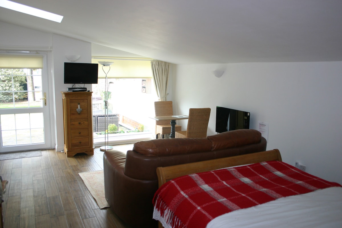Una fabulosa suite con jardín con su propia entrada independiente y jardín trasero equipado con muebles de roble macizo de alta calidad, baño privado, cocina totalmente equipada y tu propio jardín privado con uso exclusivo de jacuzzi. Para un mayor lujo, le suministramos albornoces y zapatillas de baño suyas. Los perros son bienvenidos bajo petición con el uso del jardín trasero, que es completamente seguro.