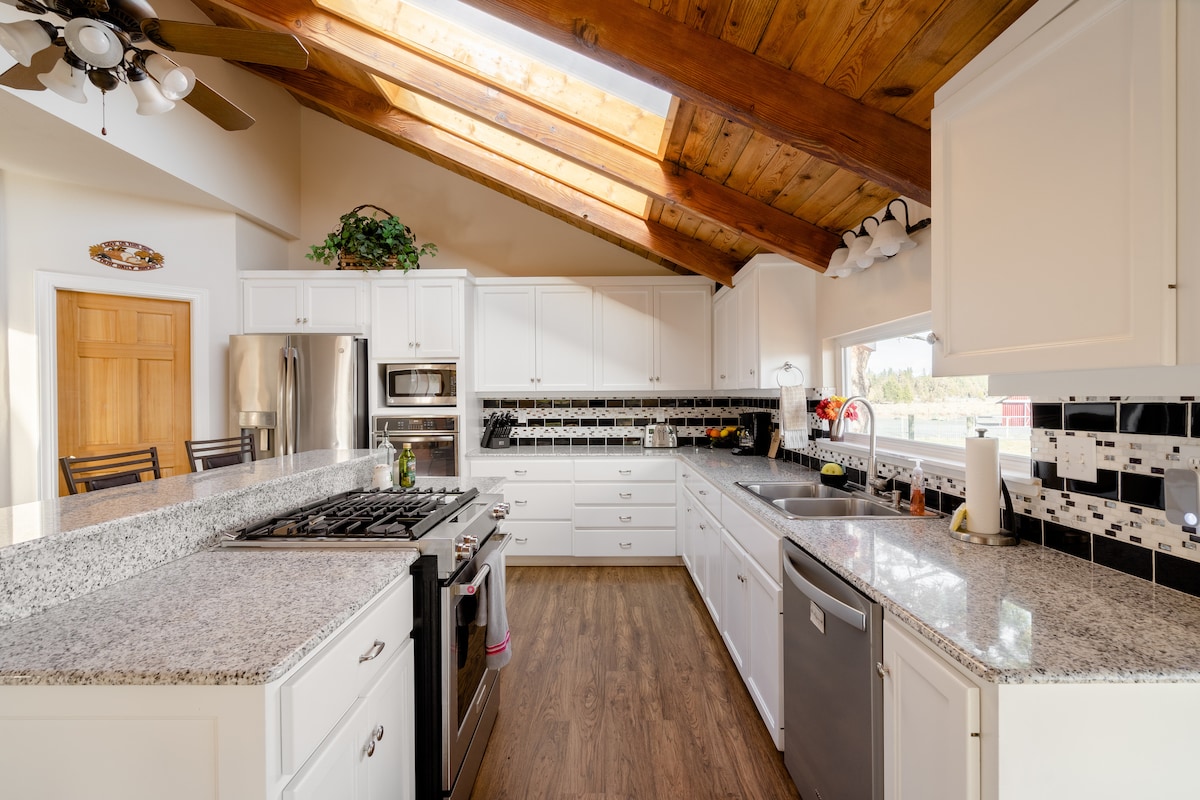 Escápate a "Terrebarn", una casa de granero única en 10 acres, a dos millas del parque Smith Rock State. Terrebarn es una casa de granero de nueva construcción en la cima de Cinder Butte, con unas vistas espectaculares de 9 montañas al oeste y unas vistas impresionantes y brillantes de Smith Rock durante todo el año al este. Pon los pies en alto y disfruta de una taza de café de cortesía mientras disfrutas de las vistas panorámicas de una terraza de 45 pies y una bañera de hidromasaje con vistas a todo el prestigio del centro de Oregón seguido de una caminata por el sendero adjunto.