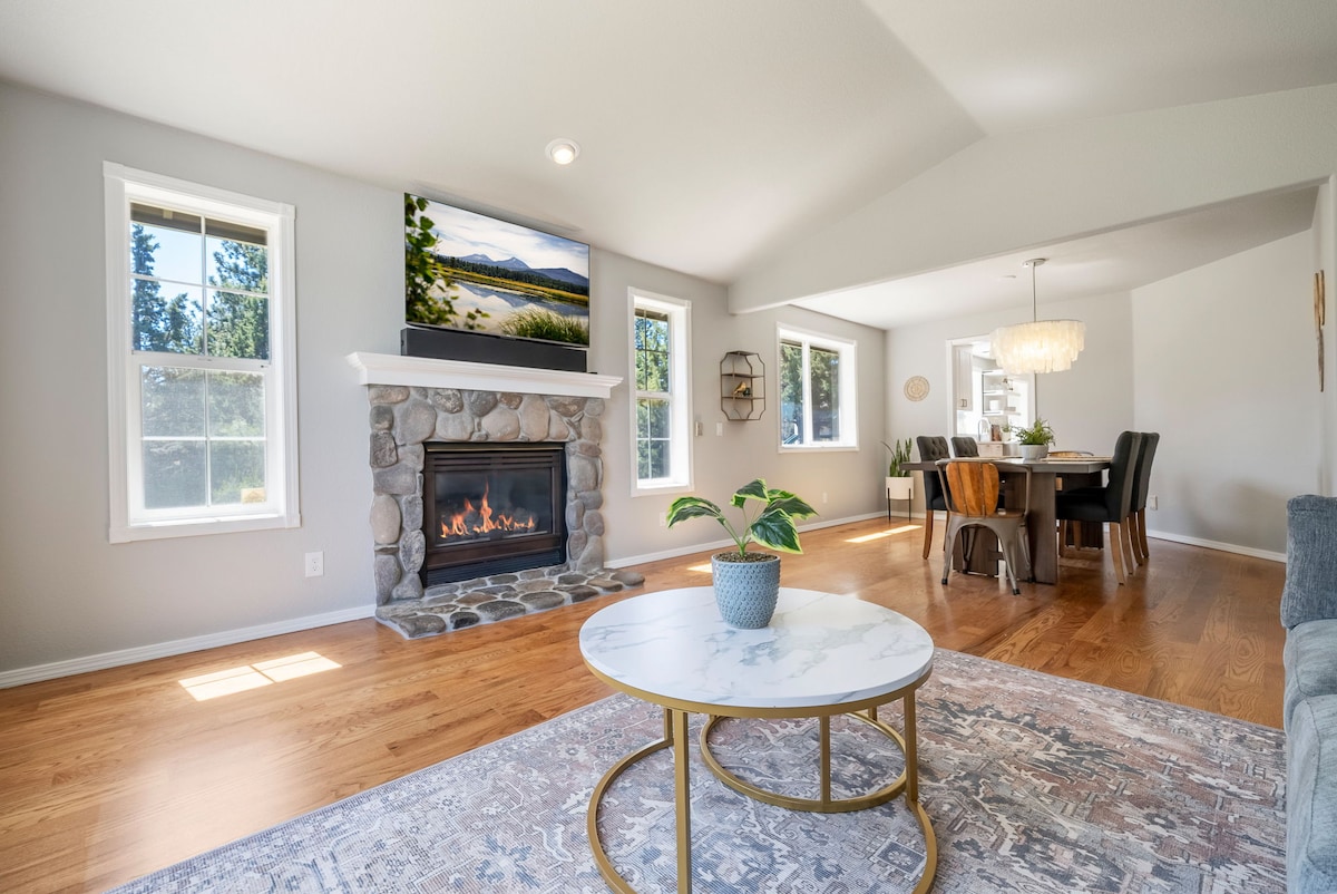 Esta casa personalizada de estilo noroeste del siglo XXI se encuentra en una tranquila calle sin salida sobre el río Deschutes, a unos 10 minutos en coche de Old Mill, rodeada de pinos ponderosa. Esta casa prémium tiene una decoración de buen gusto y preciosos detalles en madera. La luz natural entra desde la pared de ventanas en la gran habitación. La casa cuenta con una cocina abierta completa con encimeras de hormigón, una gran chimenea de leña, suelos de madera y una amplia terraza.