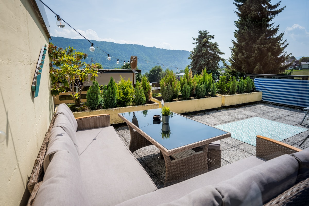 Our modern apartment has a terrace with a spectacular view over lake Wörthersee and the Karawanken Mountains, close to the Velden train station & A2 Süd Autobahn. The building is situated next to the forest, where you can make wonderful hikes. There are three lakes in the nearest surroundings where you can do all kinds of watersports. Velden am Wörhtersee has a lot to offer: shops, restaurants, terraces and a casino. Italy and Slovenia reachable in 30 minutes by car. You will never get bored.