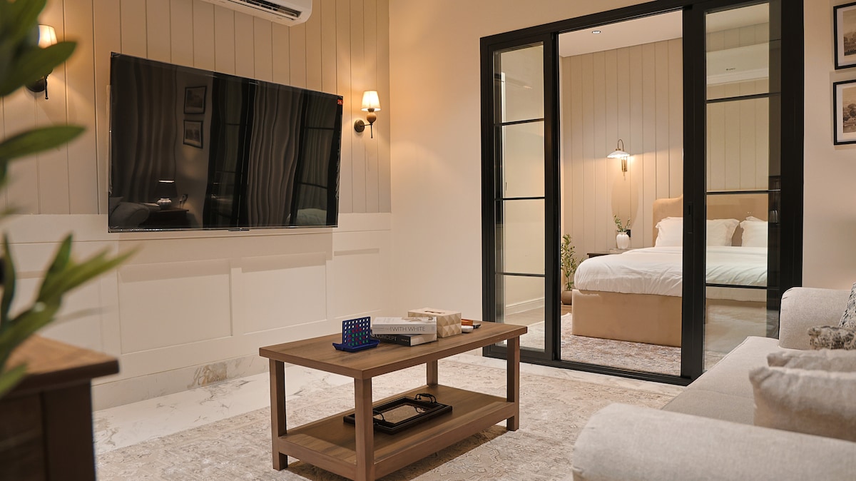 Relájate en este alojamiento rural único con grandes ventanales y cerca de todos los servicios y lugares de ocio y turismo, y con una gran pantalla en el salón y el dormitorio con suscripciones de Netflix y Shahid, Y con una mesa de comedor y todas las comodidades que facilitan la vida, como champú, jabón y toallas.