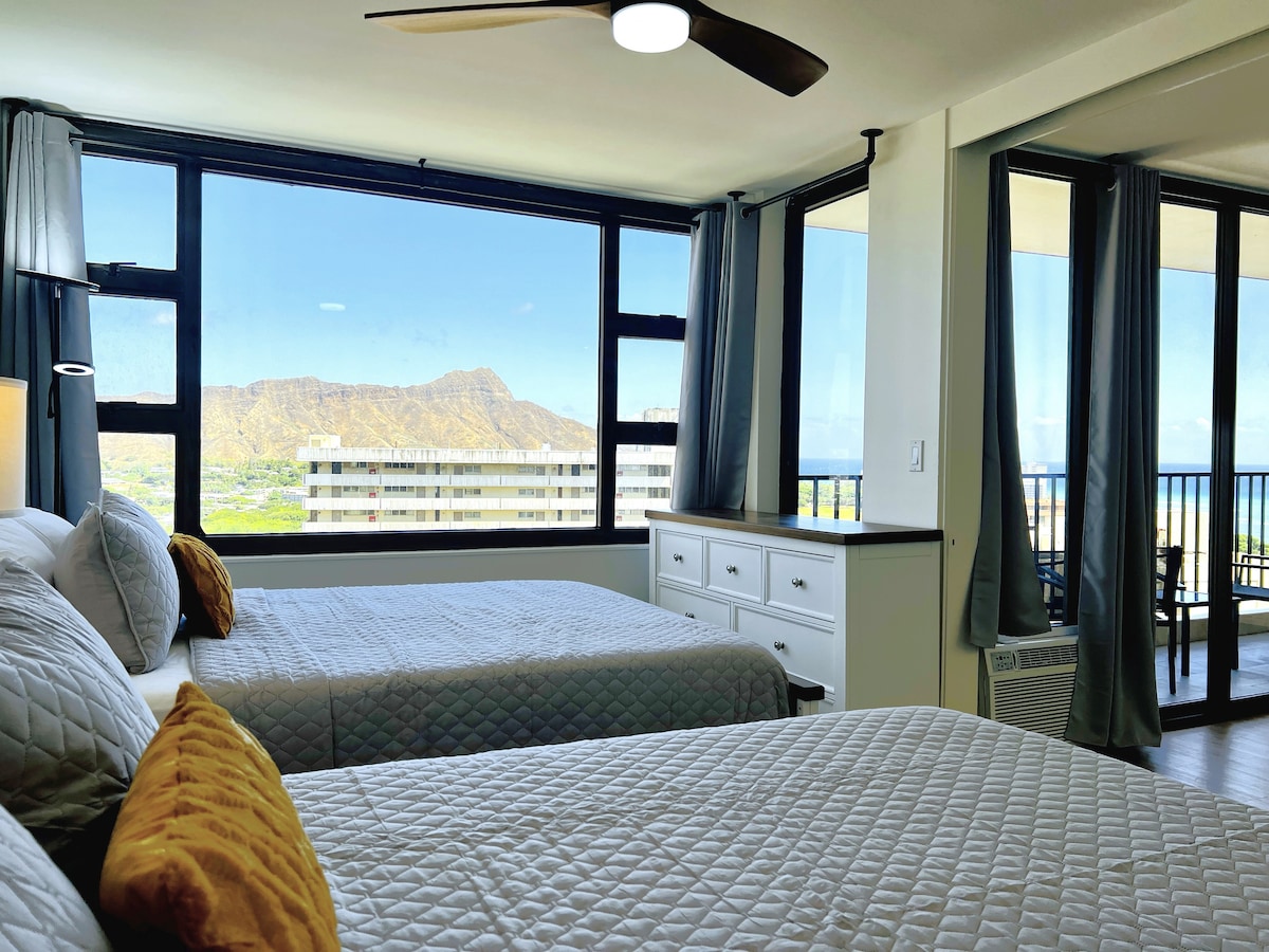 ¡Ubicación, ubicación, ubicación! Impresionante ático a solo una manzana de Waikiki Beach. Planta superior en el Waikiki Grand Hotel: ¡2 estudios combinados en 1 espacioso y renovado refugio! Disfruta de impresionantes vistas al mar y a Diamond Head desde tu suite. La magia del amanecer y la puesta de sol te espera en la terraza. Cocina americana + equipo de playa incluido. APARCAMIENTO GRATUITO, aunque no se necesita coche: ¡a pie de la playa, tiendas y vida nocturna! Ideal para familias, viajes de negocios o estancias en solitario. ALQUILER VACACIONAL LEGAL Todas las comisiones están INCLUIDAS en el precio