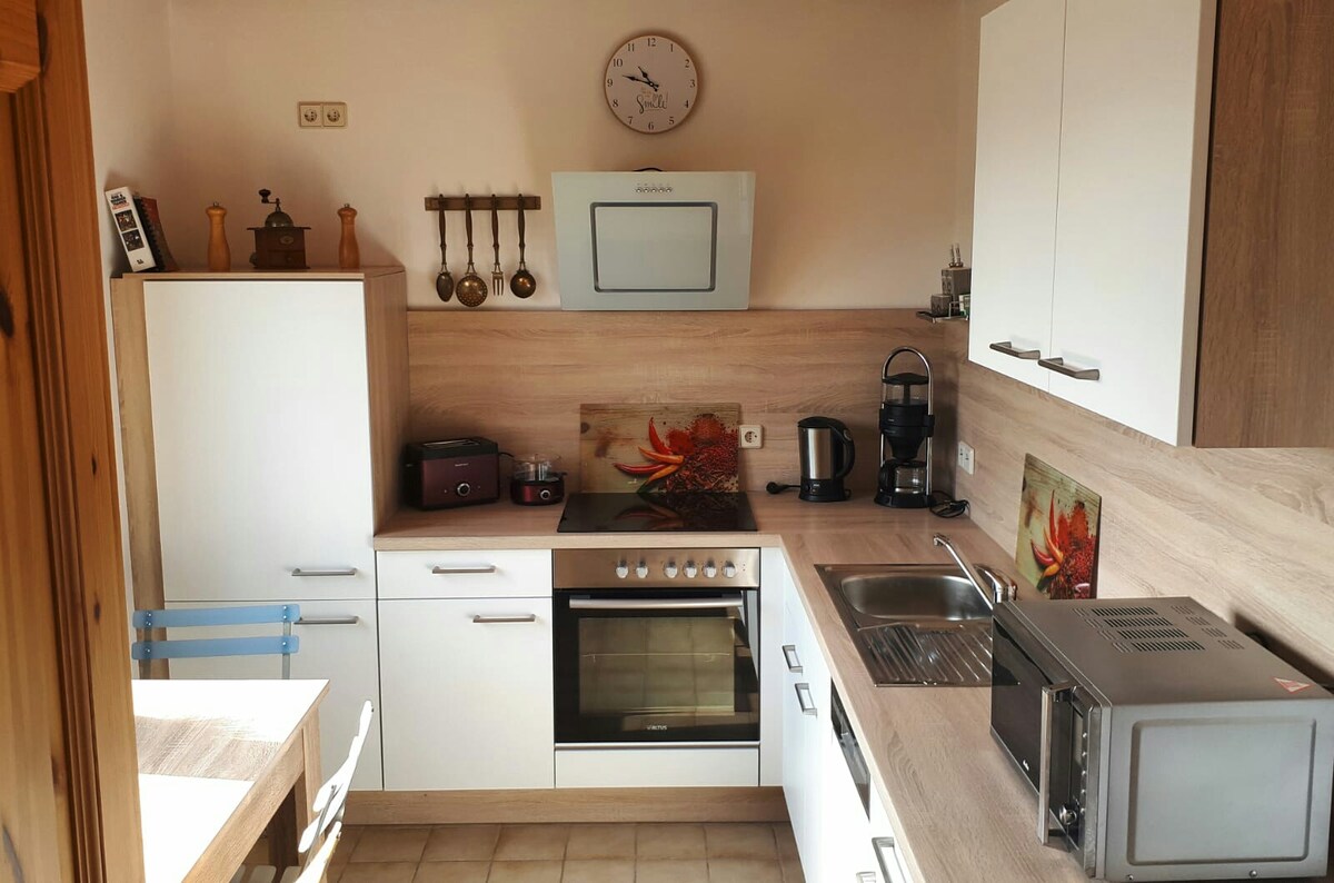 La antigua congregación de la granja original ha sido convertida por nosotros en un espacioso apartamento ático. El apartamento, construido en el frontón, emana un encanto muy especial. En el apartamento de 75 metros cuadrados, hay un dormitorio con una cama de matrimonio y una cuna y un amplio salón con una cocina abierta totalmente equipada. El moderno baño tiene una ducha a ras de suelo con calefacción en la pared.