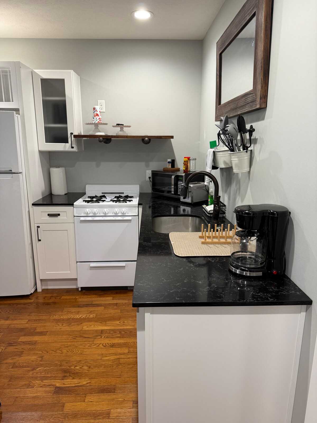Maravillosa casa privada con entrada o aparcamiento en la calle en el centro de Abilene. Esta casa tiene maravillosos muebles de madera antigua en todas partes, ¡pero todos los colchones y sofás son nuevos! Hay dos dormitorios individuales, cada uno con una cama tamaño queen. El sofá cama también tiene un colchón tamaño queen. La casa tiene una cocina estilo galera, con nevera y horno. La cocina está equipada con sartenes y una gran variedad de utensilios. El pequeño comedor y un baño completo completan la casa.