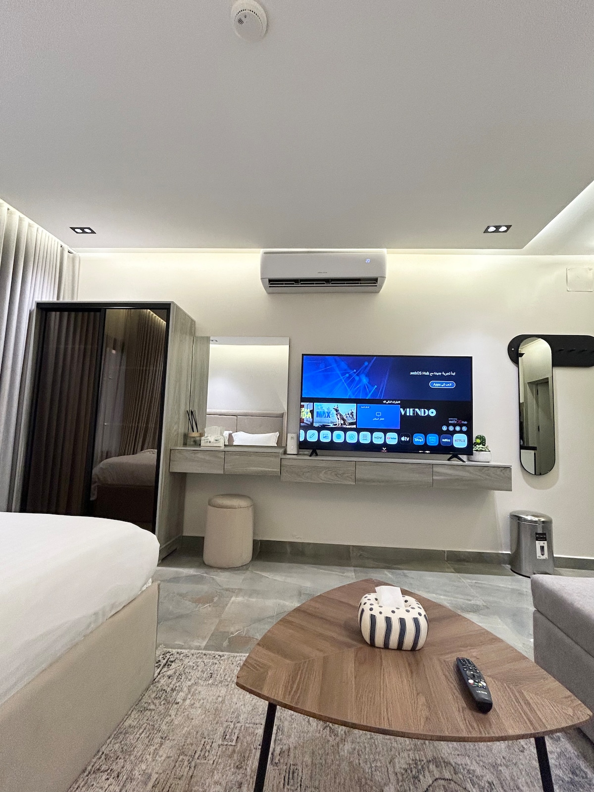 Suite Real 🏨 Ubicación: Distrito de Hittin | Riad 📍 Ubicación privilegiada: cerca de todos los servicios y eventos. 🛍️🎢 Plaza Saad: 3 min Riad Boulevard: 5 minutos. Valle de Laysen: 10 minutos. Distrito financiero: 15 minutos. Parque Riad: 13 min. Aeropuerto: 17 min. Composición de la suite: Habitación + sala de estar + cocina + baño Servicios: Televisor de 85 pulgadas, cómodos sofás. Baño totalmente abastecido: jabón, champú, acondicionador, cepillo de dientes. Iluminación ajustable. Nevera, tetera, microondas.