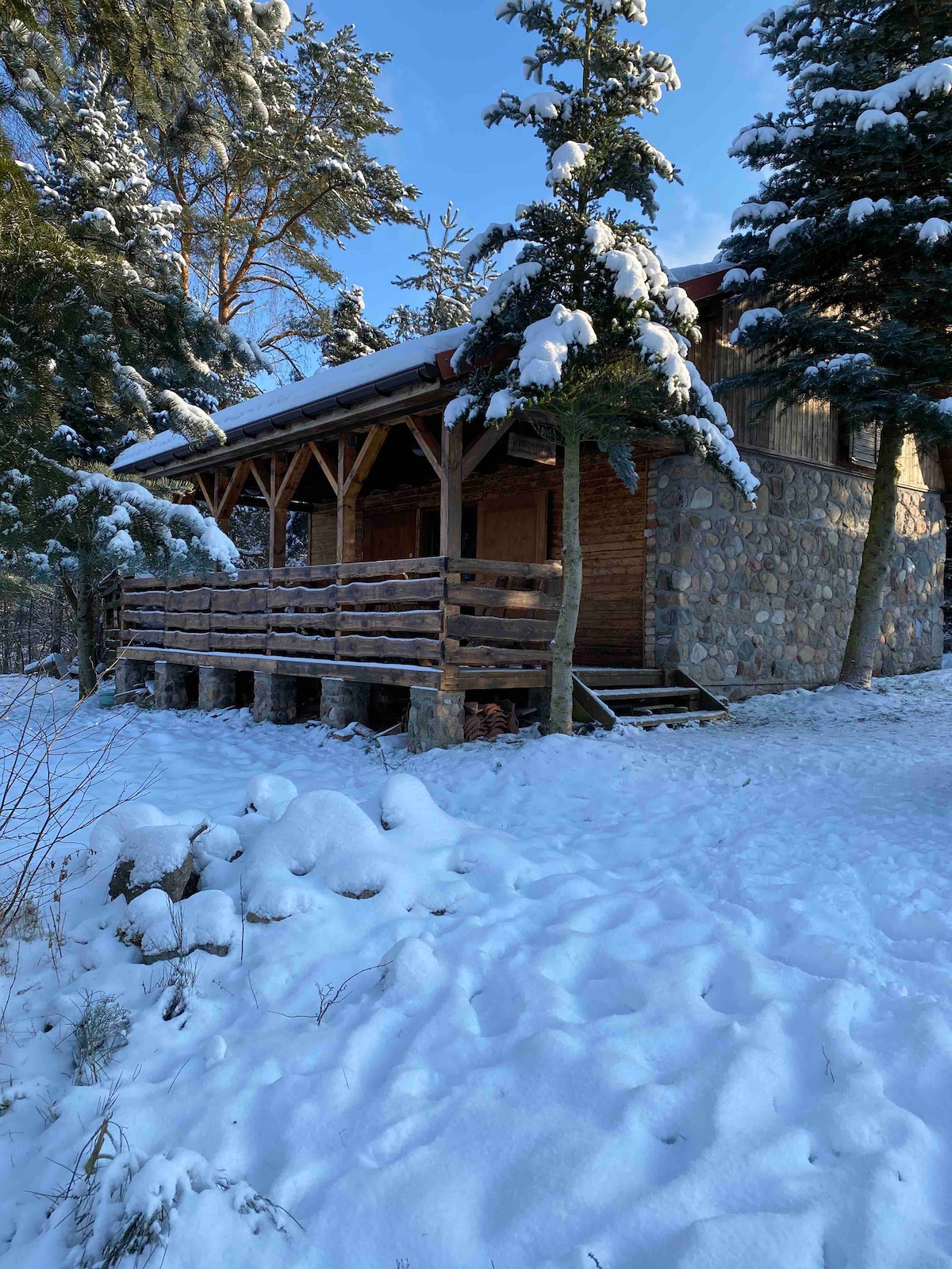 Casa de madera con un ambiente único junto al bosque. Hay un estanque con un puente justo al lado de la casa. Hay un barco y leña gratuita para la chimenea y la hoguera. A una distancia de 10 km, una piscina con saunas, una playa gratuita, a 12 km de la casa se encuentra uno de los campos de golf más bonitos de Europa: Modry Las. Hay una segunda casa de campo de alquiler verde adyacente en la propiedad. Alquiler de toda la instalación bajo el nombre: «Cottages by the pond near the forest - exclusive facility» por 590 PLN/noche