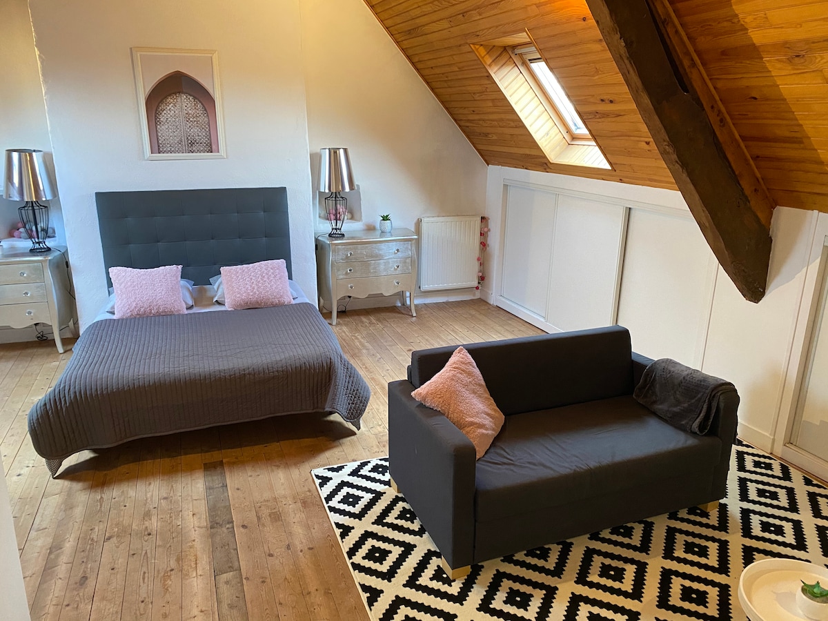 En pleno centro de Dinan, déjese transportar por la elegancia de la antigua Roma. Relájese en una suite de lujo con balneario privado 🛁. Disfrute de la comodidad de una cama tamaño queen con ropa de cama de hotel🛏️, cocina equipada, TV conectada con Netflix, wifi de fibra y una terraza íntima. A dos pasos de la Torre del Reloj y del pintoresco Jerzual. Aparcamientos, restaurantes y tiendas en las inmediaciones. Todo está preparado para una escapada romántica inolvidable ❤️.