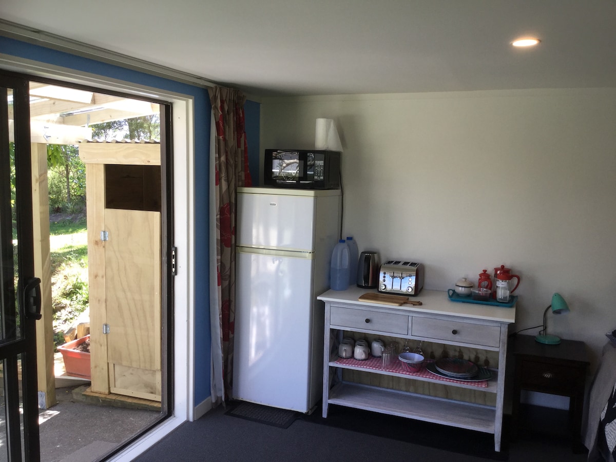 Nuestra cabaña tiene una conversión de monoroom totalmente aislada de 26 metros cuadrados. 1 cama tamaño queen +2 camas individuales. alfombra, zona de desayuno con nevera/congelador tostadora,jarra,microondas. Televisores de 32 pulgadas <NZ, reproductor de DVD y DVD,juego de cajones. Sillas de mesa por dentro y por fuera. Una zona de cocina semi cerrada delante de la cabaña con placa calefactora + 1 anillo de gas. Zona de cocina adicional cerca con barbacoa + 2 anillos de gas, sartenes,olla,utensilios, fregadero de agua H&C. La ducha/inodoro de invitados está en nuestra casa, tiene una entrada privada separada. El aparcamiento está justo en frente de la cabina.