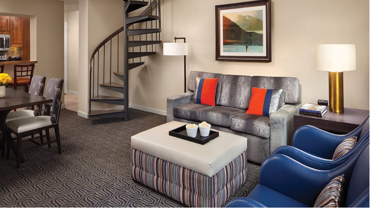 Marriott Vacation Club Resort In West Vail, CO. A two bedroom villa with loft and spiral staircase to the loft in the Douglas building. Sitting Area, Full Kitchen, Dining Area, Balcony, Fireplace Beds and Bedding Maximum occupancy: 10 Bedroom 1: 1 Queen bed, 1 Twin bed chair Bedroom 2 (Loft): 1 King bed Bedroom 3 (Loft): 1 Queen bed Sitting Area: 1 Sofa bed, 1 Twin ottoman bed No Air Conditioning