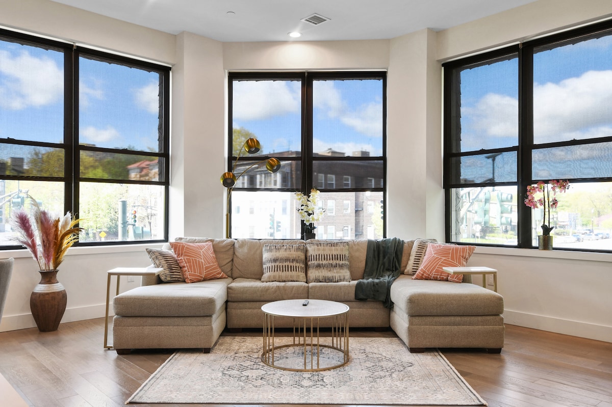 Entra en este luminoso apartamento, donde los suaves tonos rubor y los cálidos neutros crean una escapada acogedora. Llega a Nueva York en 30 minutos o conduce 15 minutos hasta el Prudential Center para asistir a eventos. Llegada desde el aeropuerto en 15 minutos y a solo 8 minutos a pie del tren. Llega a American Dream en 15 minutos. 🏋️♂️Gimnasio 24/7 🚘 Estacionamiento gratuito Vistas de la🌇 ciudad Acceso al🛗 ascensor 🛏 Cama tamaño king + 2 camas individuales 🍳 Cocina Totalmente Equipada 🍽 Cena para 5 📺 Televisores inteligentes en cada habitación 🛜Wifi rápido 🪑 Escritorio 🧺 Lavadora/secadora 🔥 Calefacción central y aire acondicionado