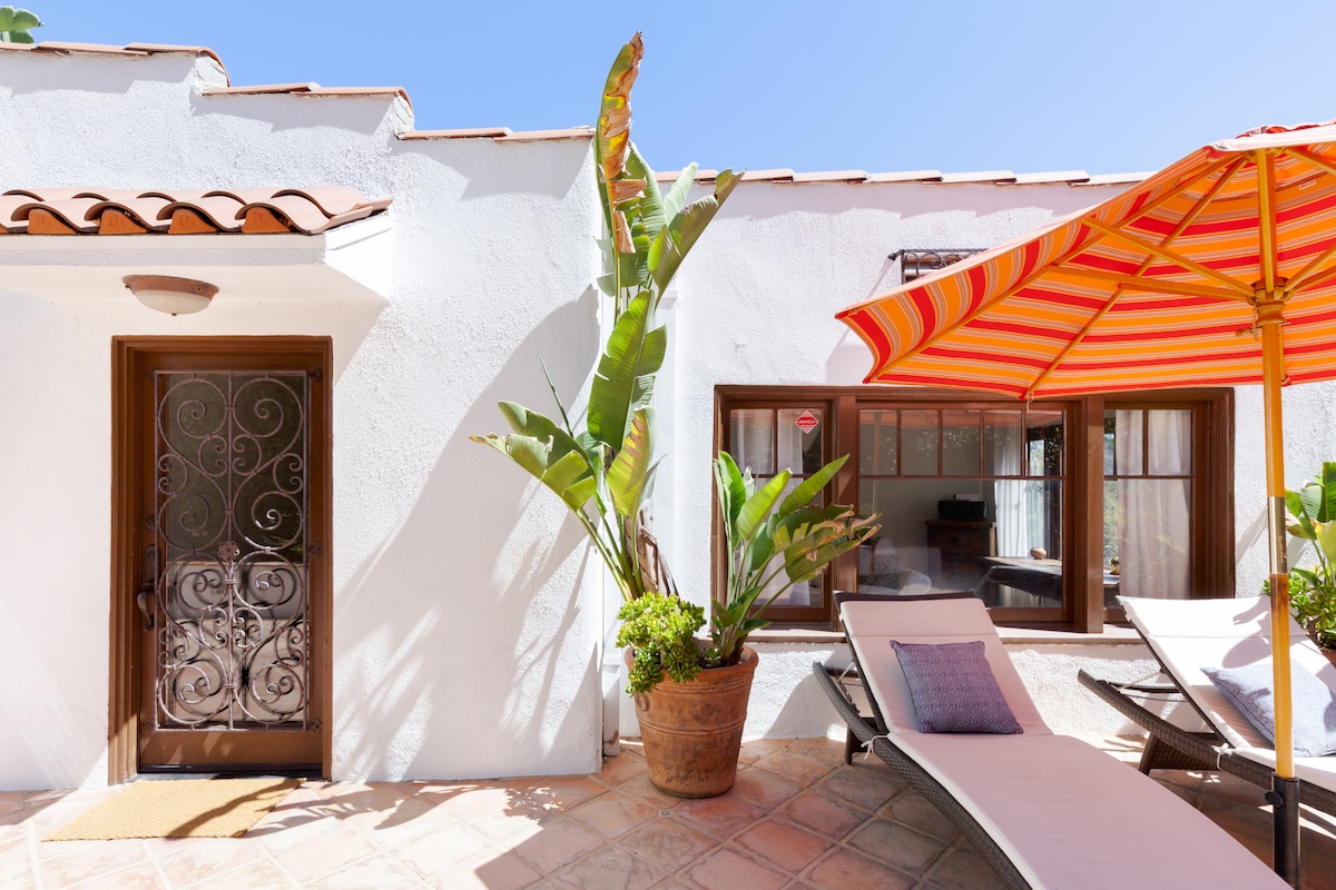 Un oasis de tranquilidad: esta villa española centenaria con apacibles jardines en terrazas se encuentra en el corazón histórico de Hollywood Hills. Esta propiedad histórica registrada de los años veinte cuenta con un espacio al aire libre sereno con jacuzzi, fogatas de gas y zona de comedor con parrilla y electrodomésticos incorporados. Ubicado a medio camino entre Hollywood Blvd y Hollywood Bowl, este barrio mediterráneo transitable fue el hogar de la primera era de estrellas de cine: Rudolph Valentino, Judy Garland, Charlie Chaplin y más.