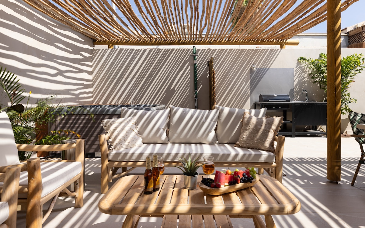 Un apartamento privado y decorado con jardín, 3 dormitorios, 2 duchas (una de ellas en el dormitorio principal), una cálida sala de estar con salida a un tranquilo jardín, una cocina totalmente equipada que incluye una máquina de café espresso y dos patios con bañera de hidromasaje, zonas de estar, una mesa de comedor, una barbacoa de carbón y una ducha al aire libre. Diseño natural con madera y cenadas, ambiente relajado y lujoso aroma a desierto. Una experiencia íntima, tranquila y lujosa, perfecta para aquellos que buscan un momento de desconexión real. Wifi, aire acondicionado, aparcamiento y servicio personal 24/7. Diseñado para familias. Parejas o grupos solo con aprobación previa. No se permiten fiestas ni música alta.