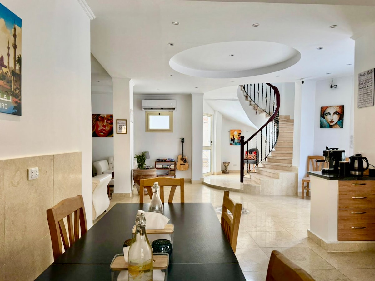 Increíble y único en Hurghada, casa de vacaciones para familias o una escapada romántica para recién casados con una gran piscina privada solo para ti, nada se comparte. Amplio salón, con cocina abierta y rincón de juguetes. Arriba, dormitorio principal con ducha y un dormitorio con cama tamaño king, litera y una Playstation 5. Baño para relajarse completamente con un gran jacuzzi. La villa está totalmente equipada con todo lo que necesitas. Será un honor darte la bienvenida y hacer que tu estancia sea increíble y organizar viajes para ti.