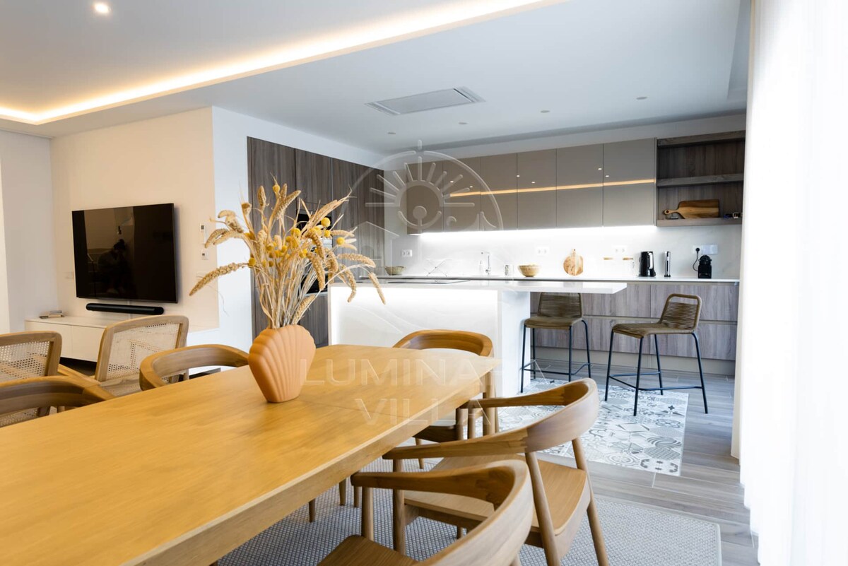 La villa Luminara cuenta con: - Tres dormitorios en suite, que proporcionan privacidad y comodidad a todos los huéspedes. - Cocina totalmente equipada, abierta al salón y al jardín. - Piscina privada con ducha al aire libre, junto a la barbacoa. - Una amplia azotea con un comedor y un rincón de salón para disfrutar del jacuzzi y de las vistas al mar. - Aire acondicionado en todas las habitaciones - Decoración moderna con un estilo natural y relajante Todo esto a 5 minutos del paseo marítimo
