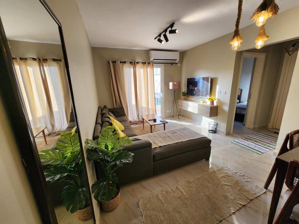 ¡Te damos la bienvenida a Kemetland! Disfruta de la comodidad y la calma modernas en este apartamento de 2 dormitorios recién amueblado con vistas a un tranquilo jardín en Madinaty B1. Diseñado con tonos suaves, iluminación elegante y detalles de estilo hotelero, este alojamiento combina calidez y sofisticación, ideal para familias, parejas o viajeros de negocios.