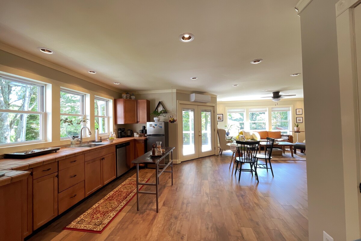 Escápate a una tranquila casa rural en Shawangunk Ridge. Relájate junto a la chimenea, sumérgete en la sauna infrarroja privada (con acceso directo al patio) o relájate fuera en la terraza de piedra natural con una chimenea y vistas al bosque. Este espacio, diseñado con esmero, desde una mesa de comedor de madera recuperada de 100 años hasta una «biblioteca significativa» seleccionada y mensajes ocultos, invita a la calma, la curiosidad y la conexión. Cerca de senderos, lagos y aventuras locales. Pensativo, acogedor y silenciosamente inolvidable.