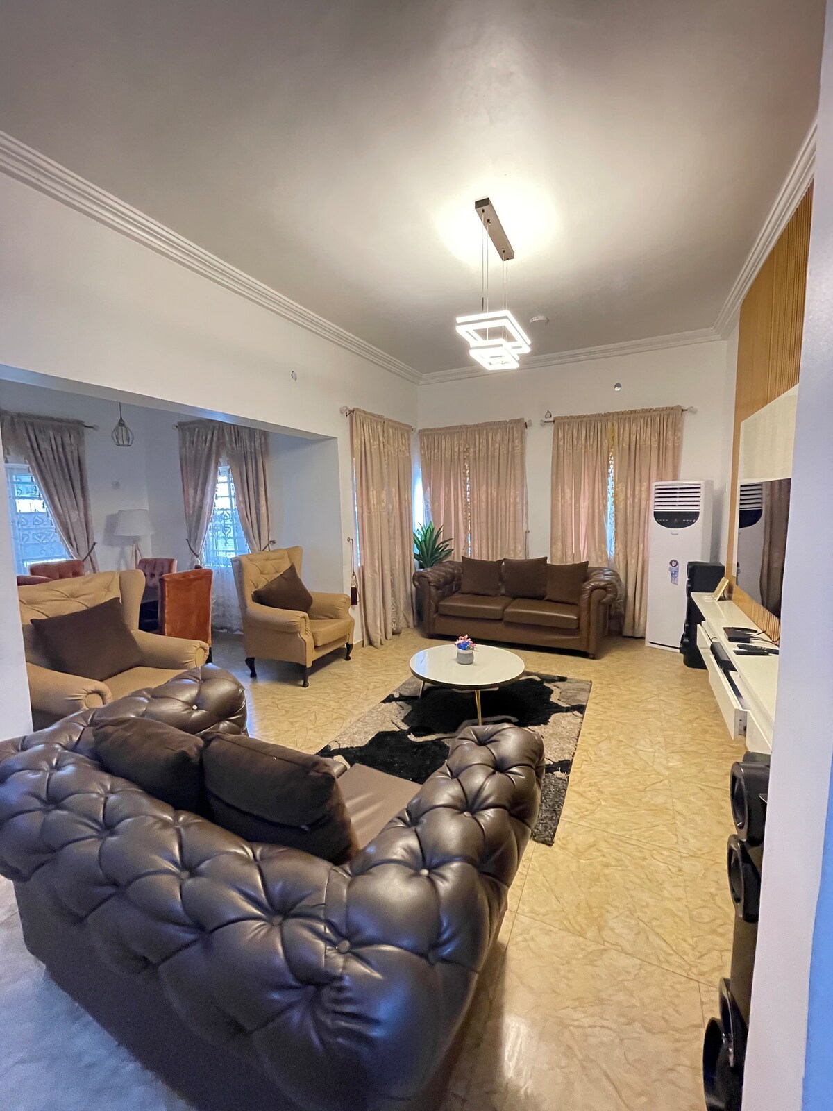 Amplio apartamento de 3 dormitorios en la mejor zona de Enugu Disfruta de comodidad, privacidad y seguridad en este NUEVO apartamento de 3 dormitorios bellamente amueblado, ubicado en una finca muy segura en la muy solicitada Centenary City, la finca residencial más segura y serena de Enugu. Características principales: Seguridad y acceso controlado electricidad las 24 horas, los Suministro de agua limpia Lavadora de ropa Cerca de supermercados, centros comerciales, mercados locales, etc. servicios de limpieza Reserva tu alojamiento AHORA