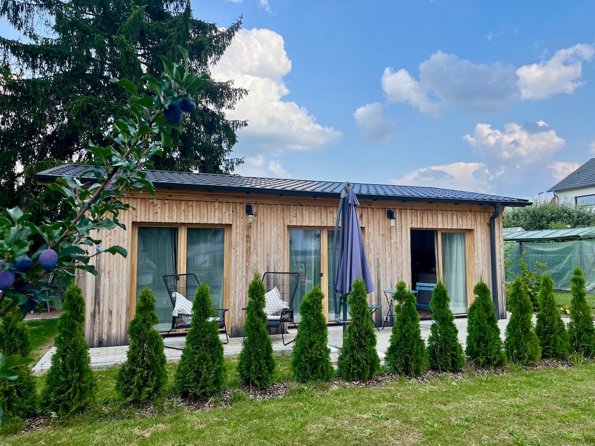 Hermosa y tranquila casa de bloques redondos para 1 - 2 personas (no es adecuada para niños menores de 10 años), zona de dormitorio como estudio abierto, armario espacioso y cocina totalmente equipada incl. Lavavajillas, chimenea, baño con ducha, lavadora, TV, wifi, terraza grande parcialmente cubierta, jardín grande, cochera cubierta, cuarto con cerradura para bicicletas (con carga para bicicletas eléctricas)