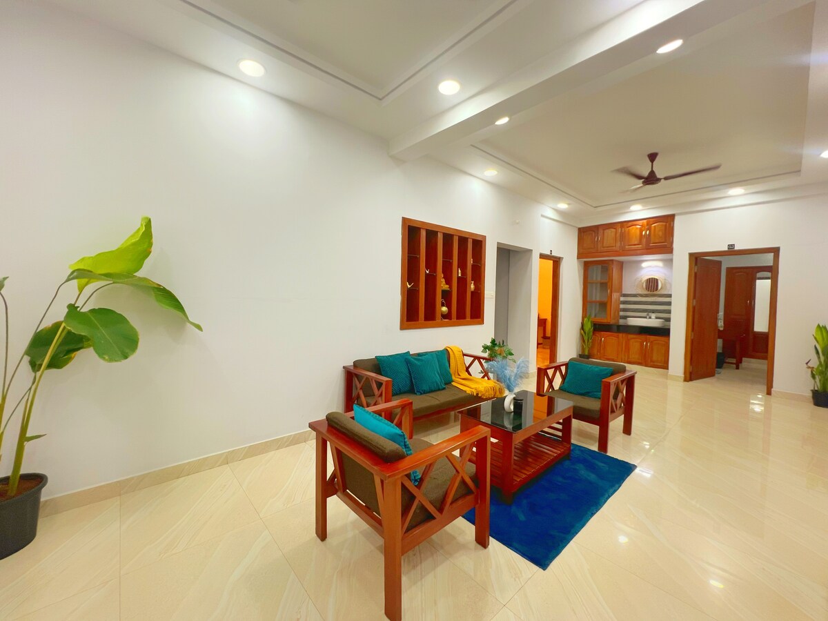 Te damos la bienvenida a The Haven. Este es un apartamento de 3 dormitorios totalmente amueblado en la primera planta con entrada privada, dormitorios con aire acondicionado, televisores inteligentes, cocina abierta, salón separado y wifi de alta velocidad. La casa incluye lavadora, aparcamiento cubierto y energía de reserva esencial. Ubicado en Maradu, se encuentra a pocos minutos de Fort Kochi y de las principales atracciones de la ciudad. Ideal para una estancia tranquila y conectada.