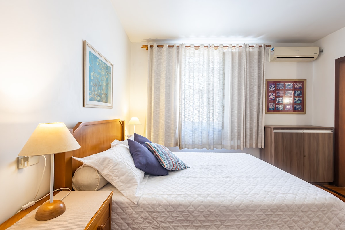 Cómodo, tranquilo y moderno apto (73 m2) situado en el centro de Río de Janeiro en Glória, con hermosa vista del extracto de Santa Teresa Florest. Cuenta con un dormitorio con cama matrimonial, un salón con sofá cama (individual o para parejas) , además cuenta con más dos colchones individuales que caben perfectamente en el suelo del dormitorio o sala de estar, con capacidad para 5 personas. Baño amplio y cocina moderna equipada. Está a 5 cuadras de la estación de metro de Glória, supermercado, farmacia...