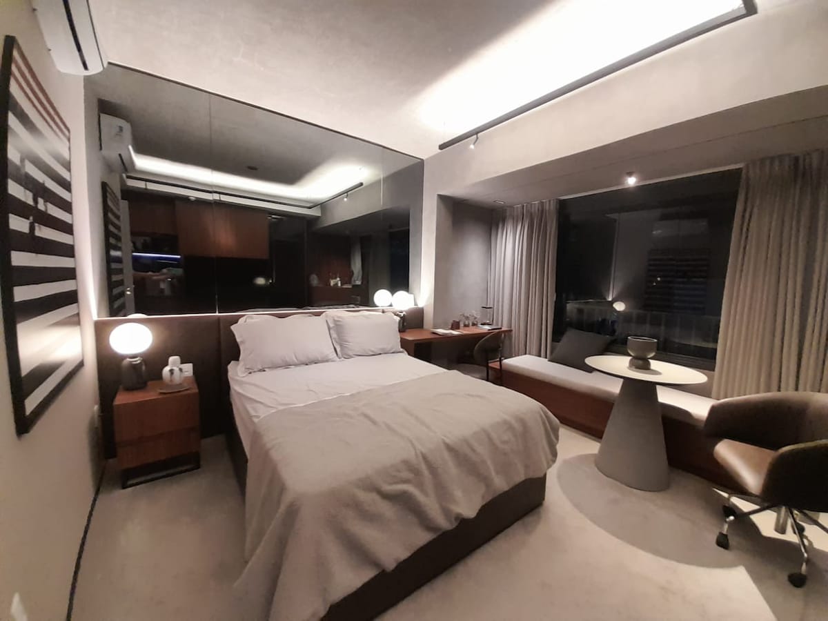 Estúdio espaçoso com muito design, arquitetura e a melhor vista de São Paulo. Loft completo! Com cama queen, closet, ar condicionado silencioso, cozinha completa, home office, WI-FI, TV 55” e uma belíssima banheira de imersão, de onde pode apreciar o seu drink preferido e curtir uma vista apaixonante. São Paulo toda estará há poucos minutos de você. Acesse o metrô andando apenas 200m. Reserve com tranquilidade! Proporcionaremos uma excelente hospedagem e uma ótima experiência!