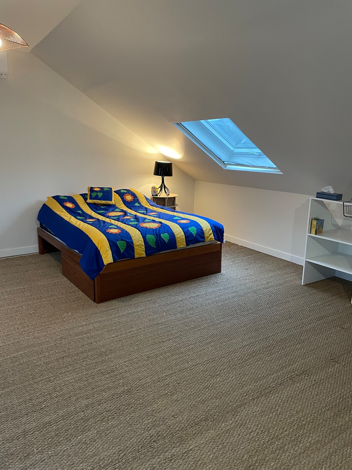Apreciará la tranquilidad y la luminosidad de esta habitación abuhardillada. En la tercera planta de una villa con jardín situada a 750 m del RER B, la habitación (cama de 160 cm) tiene un inodoro y un gran baño privado con almacenamiento. La habitación se cierra con llave. Hay un hervidor de agua disponible en la habitación. Aceptamos su mascota bajo petición (2 perros y 4 gatos en la casa). Está incluido el desayuno.