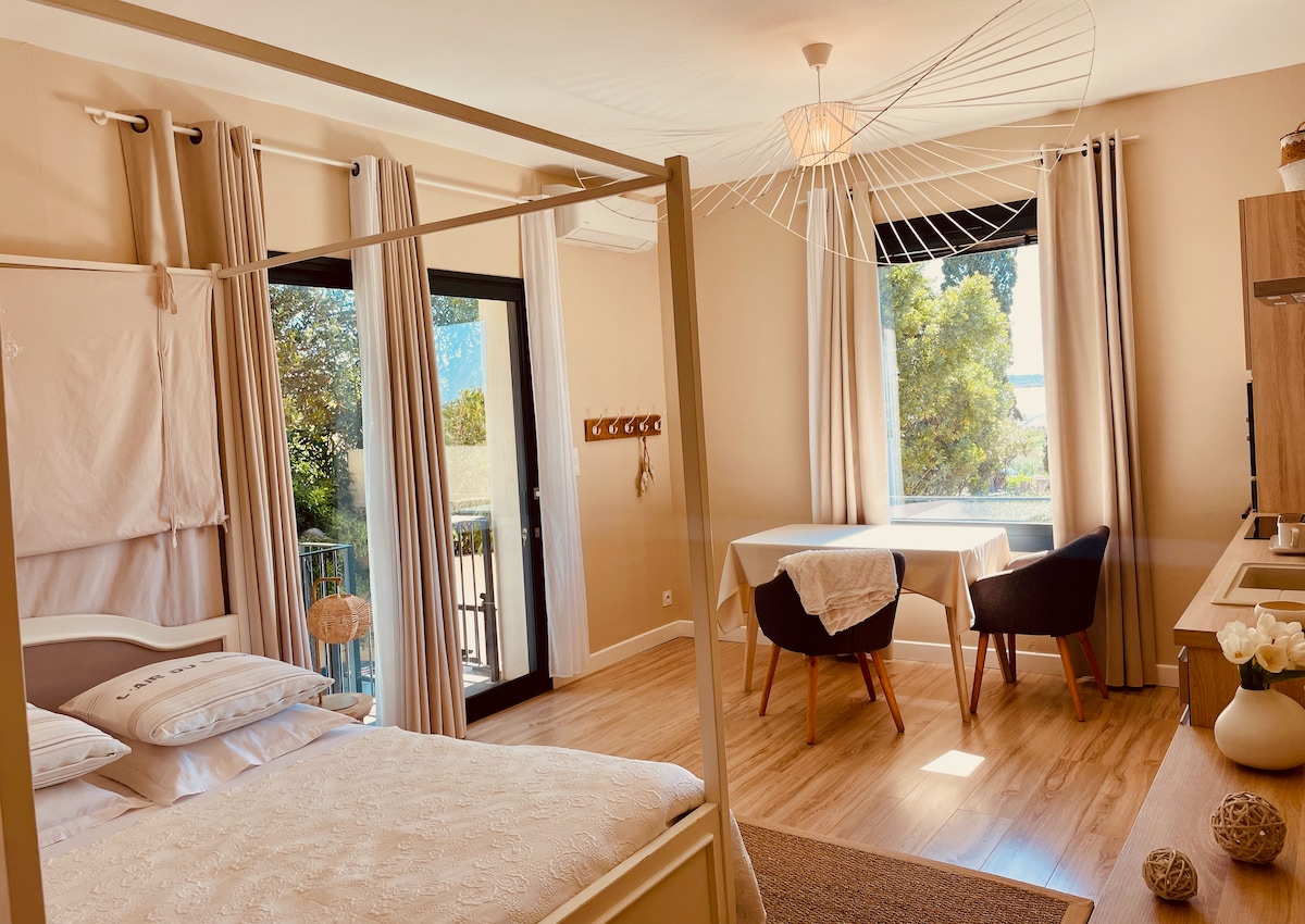 L'Instant Suspendu: suite con spa y horizonte infinito Disfruta de la magia única de la única suite de balneoterapia en primera línea de playa ❤️. Tu bañera de hidromasaje privada, situada justo frente a los ventanales que van del suelo al techo: un encuentro hipnótico cara a cara con el Mediterráneo. Emoción: contempla el amanecer desde la comodidad de tu baño o desde tu balcón privado. Comodidad: pies en la arena, wifi de fibra de alta velocidad y refrigeración natural con ventilador de techo. Ubicación: 3.ª planta con acceso directo a la playa, sin necesidad de cruzar carreteras