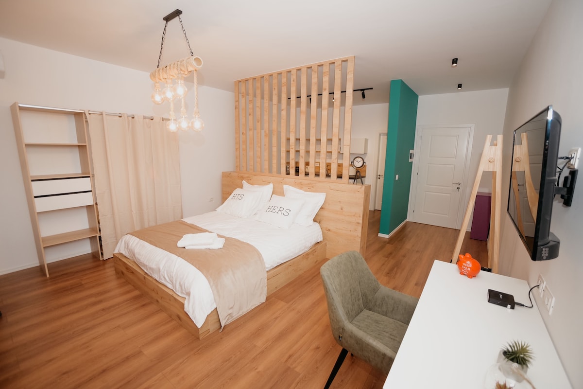 ¡Te damos la bienvenida a este elegante y recién renovado estudio, situado a solo 1 minuto del vibrante centro de la ciudad de Tirana! Perfecto para personas que viajan solas o en pareja, este moderno espacio combina comodidad, comodidad y un toque de lujo. La habitación se encuentra en la primera planta del edificio (planta baja, primera planta) Ya sea que estés en la ciudad por negocios o por placer, este espacio ofrece todo lo que necesitas para que tu visita sea inolvidable, a pocos pasos de restaurantes, tiendas y atracciones.