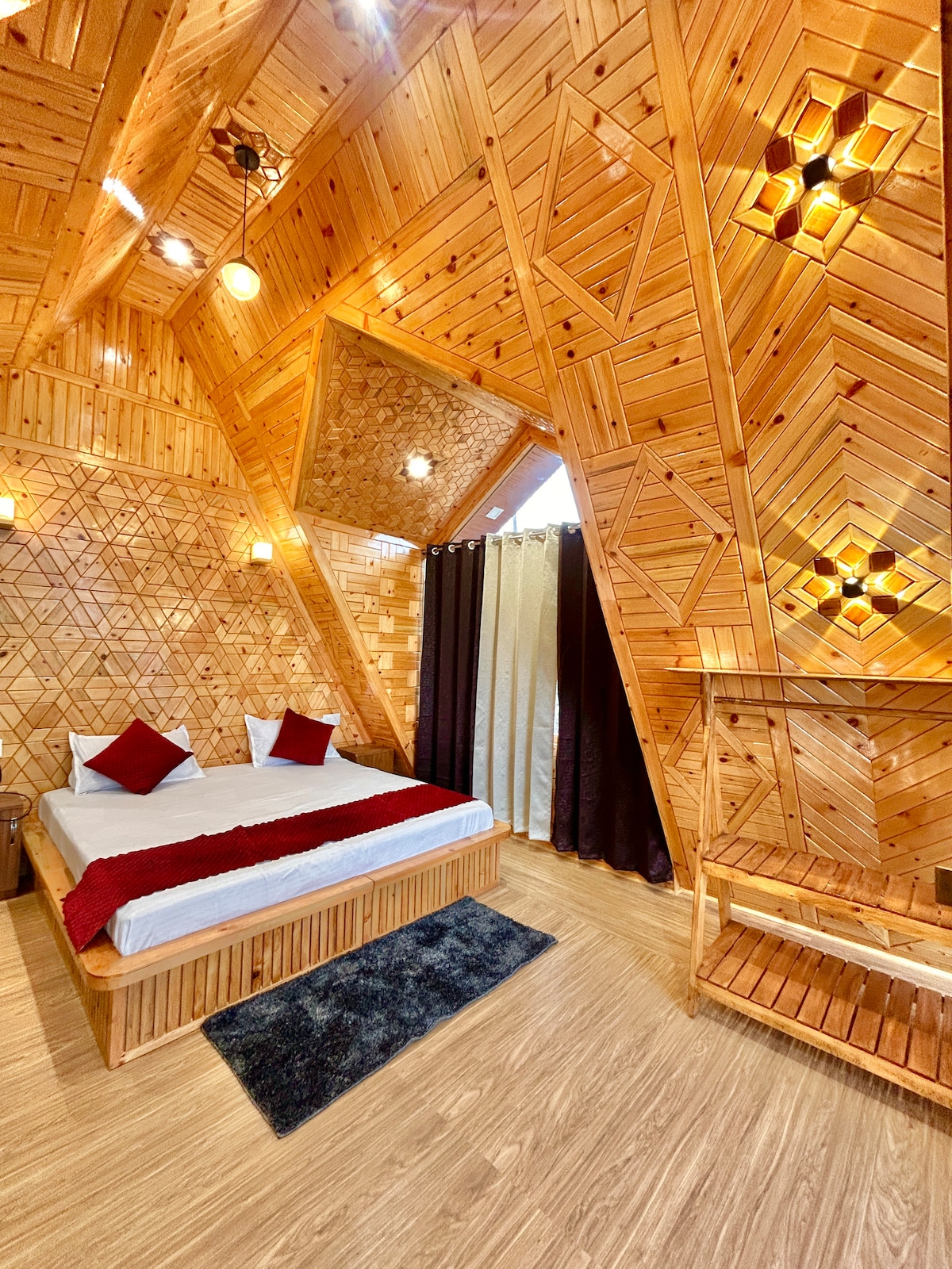 Glamoreo, a solo 1 hora de Shimla. Impresionante interior de madera de nogal, incluidos todos los muebles. Bañera de madera al aire libre, perfecta para sumergirte en el aire fresco de las montañas. Los alrededores son abiertos y amplios. Puedes pasear, disfrutar de las vistas panorámicas y hacerte una idea de la vida rural. Todo aquí es orgánico, desde alimentos hasta productos lácteos. Si no te apetecen comidas caseras, hay cafeterías y restaurantes a solo 3–4 km de distancia, y puedes visitarlos o recibir comida a domicilio