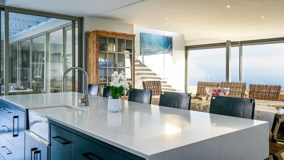 Disfruta del mejor estilo de vida costero en nuestra lujosa casa en lo alto de un acantilado con impresionantes vistas al mar desde todas las habitaciones. Nuestro diseño moderno y orgánico cuenta con madera natural y muebles de diseño. Sumérgete en nuestra piscina semitérmica, disfruta de nuestra zona de yoga y relax o cocina en nuestra cocina de diseño. Completa con sistema de energía solar y situada en una reserva natural privada. A solo 25 minutos del aeropuerto de George, a 15 minutos del centro comercial Garden Route y Wilderness. Ven a relajarte con comodidad y estilo.