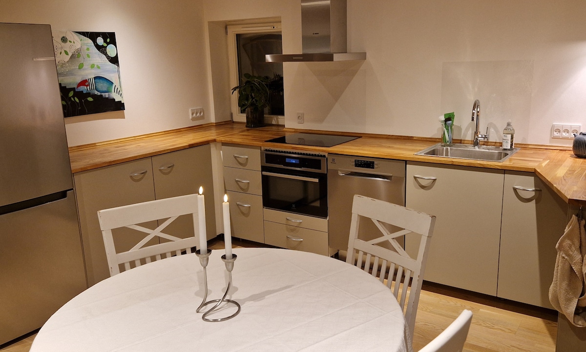 Villa de nueva construcción para ti. A 3 km del centro. La casa ofrece: 2 dormitorios. Una habitación con TV y una cama plegable. Otro dormitorio con cama king size grande. 2 aseos y un baño. Cocina grande/sala de estar. Mesa de comedor para 8 personas. Cocina con todos los utensilios de cocina comunes para que puedas cocinar, hornear pasteles, etc. Sala de estar con TV de 75 pulgadas y buen sonido envolvente y reproductor de DVD. Netflix, HBO, TV2 Play gratis. Wi-Fi gratis Terraza cubierta con asador a gas. Estacionamiento en la cochera cuando no llueve.