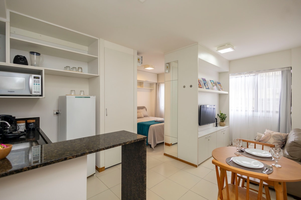 Descubre StudioK: un remanso de naturaleza y sofisticación en el corazón de Águas Claras. Nuestro estudio combina un diseño depurado con la frescura de las plantas y ofrece servicios exclusivos, ropa de cama de primera calidad y cocina con nevera de 380 litros. Disfruta de un televisor 4K giratorio y de un potente aire acondicionado. En DF Plaza, tienes acceso directo en ascensor a las piscinas, a un gimnasio de alta gama y a los mejores restaurantes (Coco Bambú/Outback). El entorno perfecto para parejas y profesionales. ¡Acomódate y siéntete en casa!