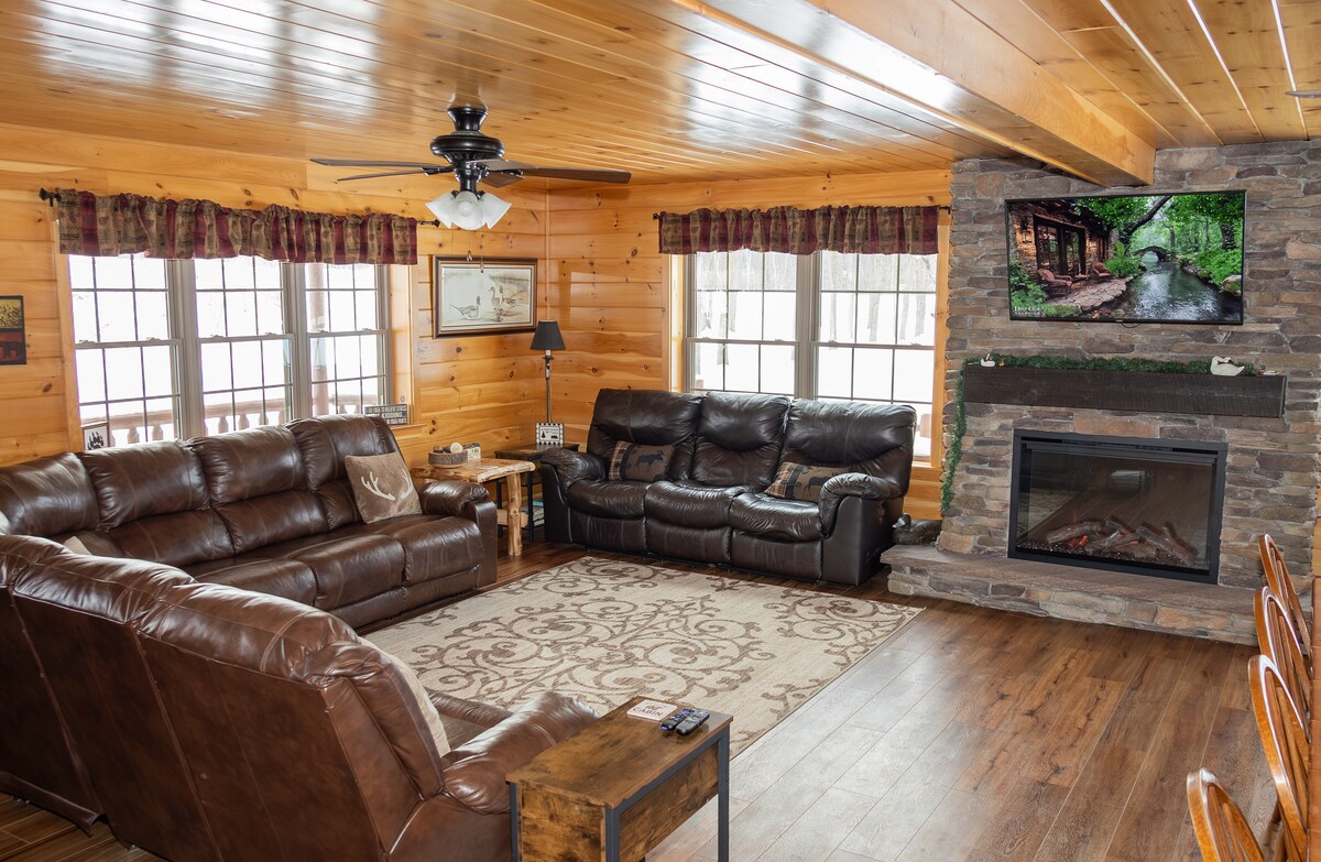 ¡NUEVO! Retiro en cabaña con chimenea, sala de juegos y jacuzzi