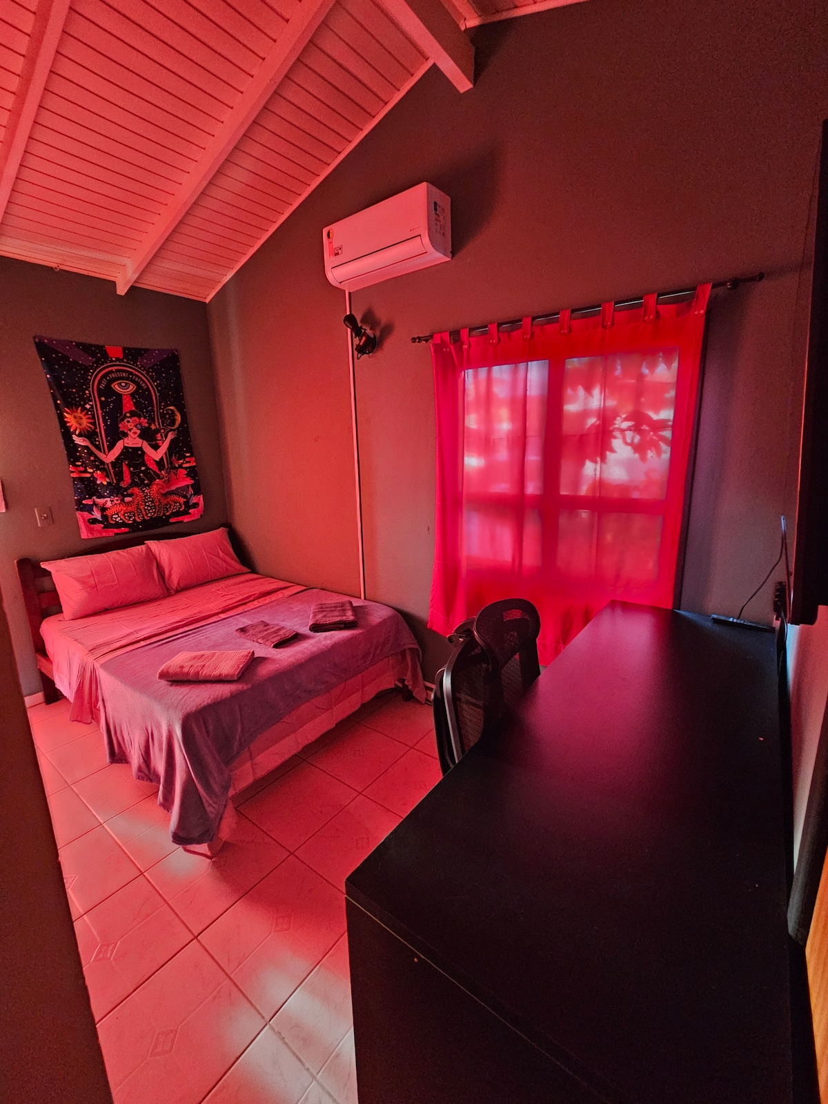 Cómodo y acogedor estudio en zona residencial muy bien ubicado. Cerca de UFSC y UDESC, y a 9 km del centro. Un lugar tranquilo, donde se pueden tener buenas noches de sueño. También hay una zona exterior en la que puedes relajarte, tomar un café y un baño para tomar el sol. ¡Te encantará! Tendrás una cocina completa, una cama doble, ducha con agua caliente, armario, aire acondicionado, wifi, televisión por cable, ropa de cama, mantas, toallas y calentador.