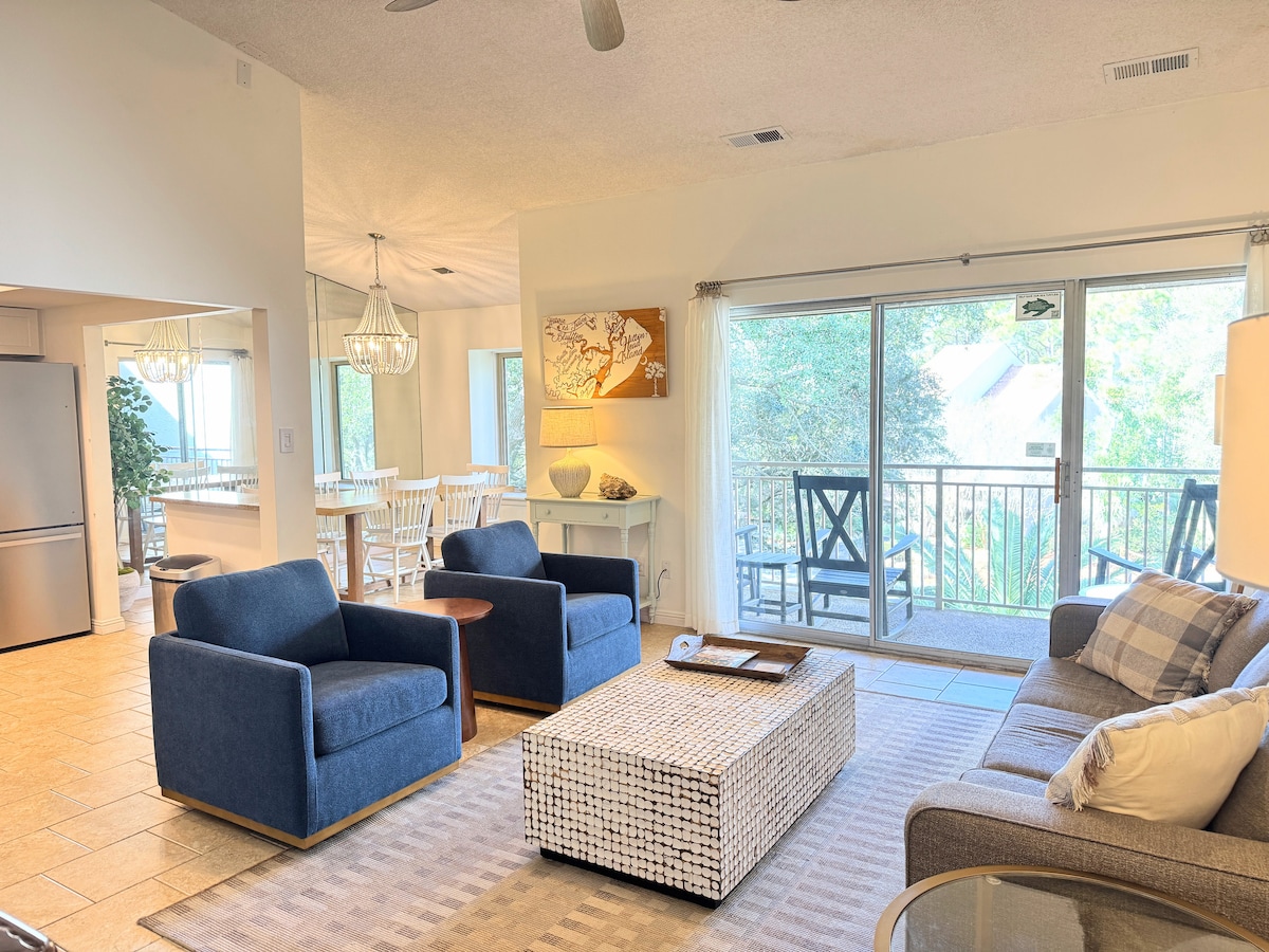 Tu tranquilo y elegante apartamento está en la playa escondida de Hilton Head, con vistas a la naturaleza, exuberantes jardines, 3 piscinas, un jacuzzi y tenis. Esta unidad de 2 dormitorios/2 baños recientemente remodelada cuenta con vistas a la laguna y al mar, un solárium con pantalla, nuevos electrodomésticos LG, mostradores de cuarzo, una cocina surtida, lavandería en la unidad, TV de 65" en la sala de estar, TV de 58"/55" en los dormitorios, equipo de playa (carrito, sombrillas, juguetes), Internet de 400 MB, ¡y sin tarifa de limpieza!