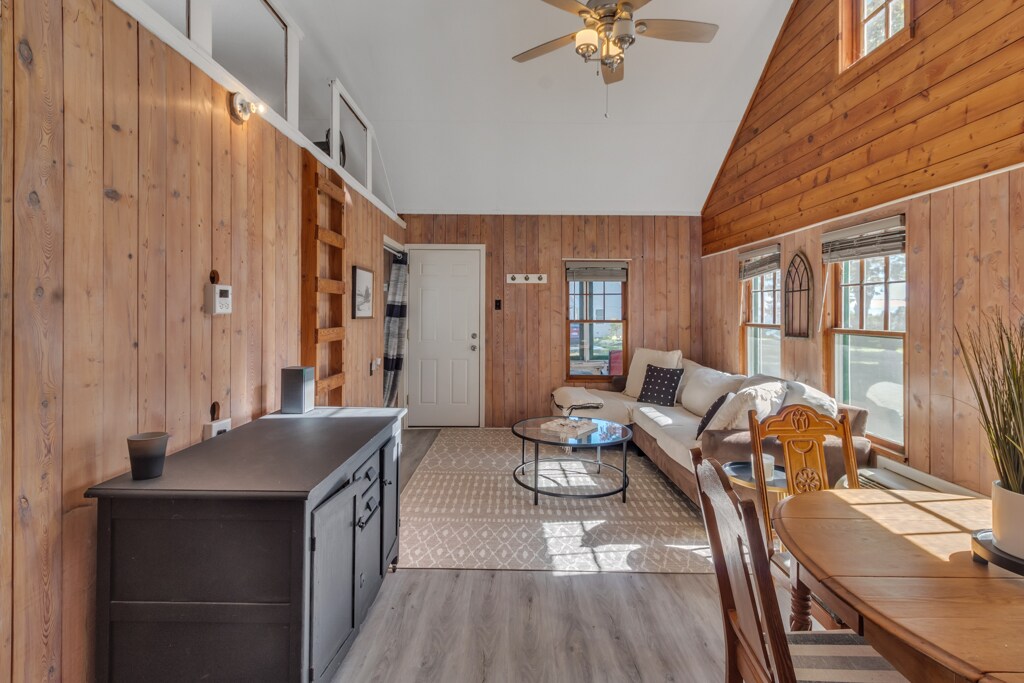 Vista infinita de alto acantilado con vistas al lago Hurón. Te encantará tu estancia debido al equilibrio perfecto entre la actividad al aire libre y la oportunidad de comunicarte con la naturaleza. Los servicios incluyen dos kayaks, una gran chimenea al aire libre, chimenea interior, playa privada y ciudades portuarias cercanas para explorar. Ideal para parejas y aventureros solitarios, esta casa de campo de pino nudoso y techos altos en el lago Hurón tiene una cocina completa con hermosas encimeras de cuarzo y puertas francesas al dormitorio.