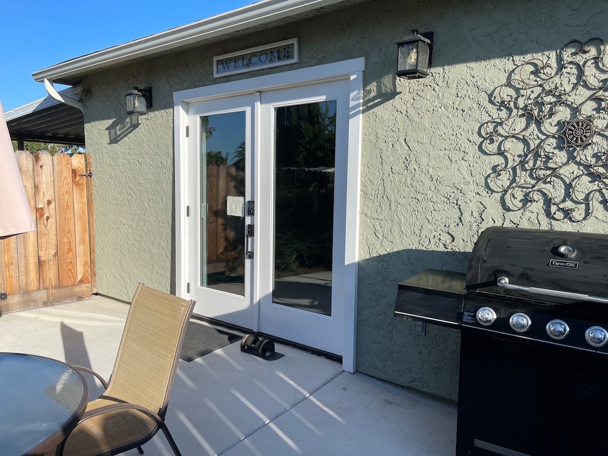 Esta pequeña casa de 400 pies cuadrados fue creada para mayor comodidad y conveniencia. Es un diseño de estudio con un espacio compartido para vivir y dormir, pero aún así ofrece una cocina completa, baño (con bañera), lavadora, secadora y estacionamiento dedicado fuera de la calle. Un espacio lleno de luz con techos abovedados, ideal tanto para estancias cortas como largas. Ofrece una decoración moderna y de diseño que incluye azulejos blancos tipo metro y estanterías abiertas en la cocina completa, sábanas de hilo alto y edredón blanco sobre un cómodo colchón y algunos coloridos azulejos españoles en el baño. Se siente como un refugio tranquilo y privado, pero aún así, está lo suficientemente cerca del casco antiguo de Clovis para ir andando a todas partes. ¡Ven y disfruta! Tienes acceso completo a esta casa. El registro de entrada y salida es independiente en esta casa. Pero, si necesitas algo, mis coanfitriones o yo estamos disponibles para ayudarte. La casa se encuentra en el encantador e histórico distrito del centro conocido como Old Town Clovis. Puedes pasear fácilmente hasta tiendas, restaurantes y festivales cercanos. También hay senderos para correr y caminar cerca. Las grandes tiendas y supermercados están a pocos minutos en coche y se puede llegar al aeropuerto en 15 minutos. Hay fácil acceso a la autopista 168 que te conecta con atracciones como los parques nacionales de Yosemite y Sequoia. Esta casa tiene un lugar de estacionamiento dedicado fuera de la calle en el lado de la propiedad. Hay taxis disponibles y una parada de autobús a 20 minutos a pie. Pero la gente suele conducir cuando visita la zona. Hay wifi y una televisión inteligente. Puedes ver suscripciones personales (Netflix, Roku, Hulu, etc.). Pero no hay televisión por cable. Este es un callejón frente a la casa donde tu «vista» serán garajes y vallas. Si bien hay parques y senderos a poca distancia a pie, no hay patio ni espacio al aire libre en esta casa (a excepción del pequeño patio delantero). Hay una casa principal frente a la calle que está separada por una valla de privacidad. Accedes a tu casa a través del callejón trasero detrás de la casa principal y tienes una plaza de aparcamiento dedicada. Si tienes más de un vehículo, tendrás que aparcar los vehículos adicionales en la calle.