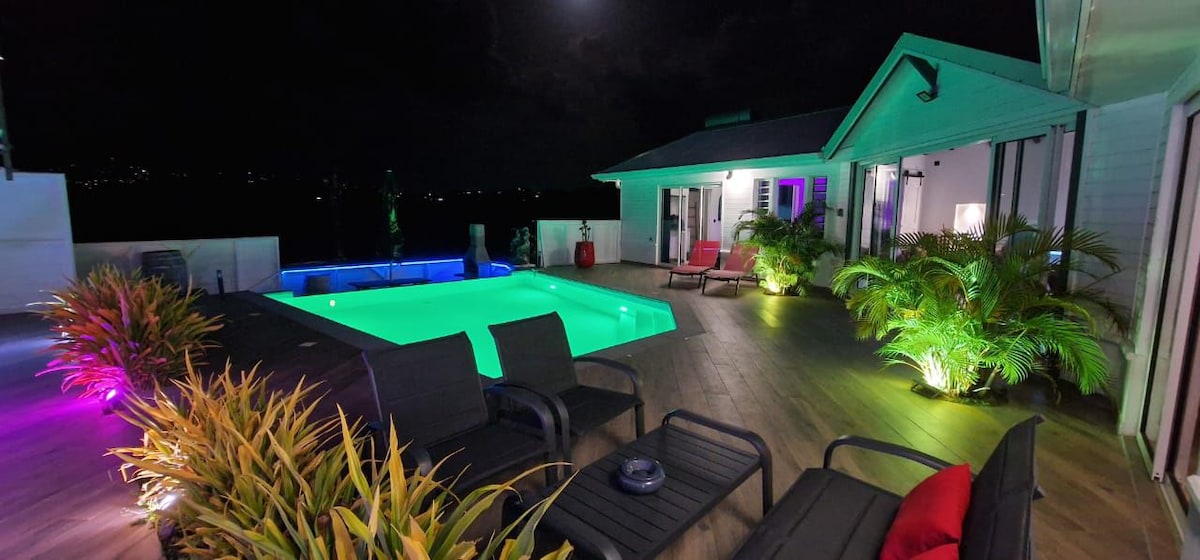 Situada en un entorno verde, en las alturas de Schoelcher, a 5 minutos de las playas. ¡Disfruta de nuestra piscina (4*8 m) y relájate tomando una copa en el bar en la terraza! La villa consta de: - 1 gran terraza con vistas al mar - 1 suite principal - 1 dormitorio (cama 140x200) - 1 dormitorio (cama 90x200) - 2 baños - 1 amplio salón con zona de TV y sofá cama. - 1 cocina totalmente equipada - Aparcamiento - Clim en las habitaciones - Se proporcionan sábanas y ropa de hogar. Nos vemos Julie y Jp