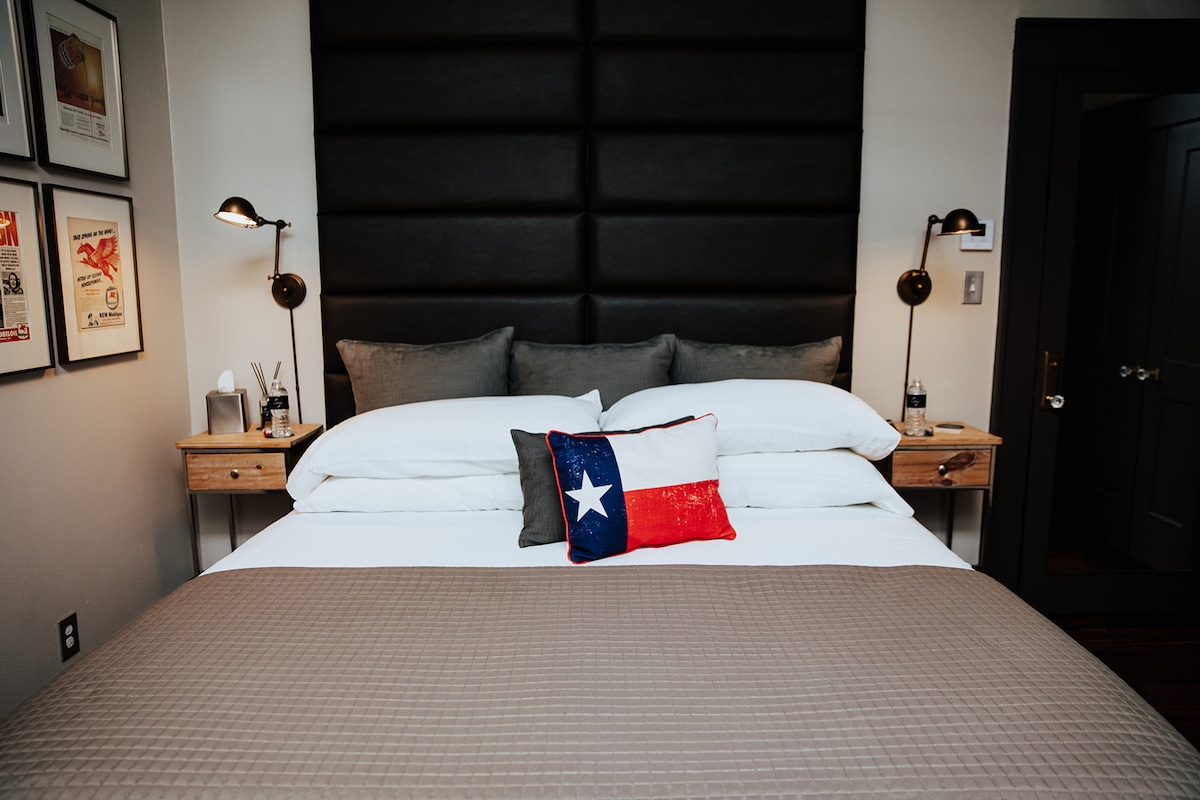 Inspired by the rich history of oil & gas in Texas, this modern industrial suite combines iconic vintage memorabilia with the sophisticated touches you expect from a boutique hotel. The Varco Room, named after a major supplier of oil & gas equipment, is a charming tribute to the industry that helped shape Texas. Check out the vintage Mobilgas pump featuring the iconic red pegasus.