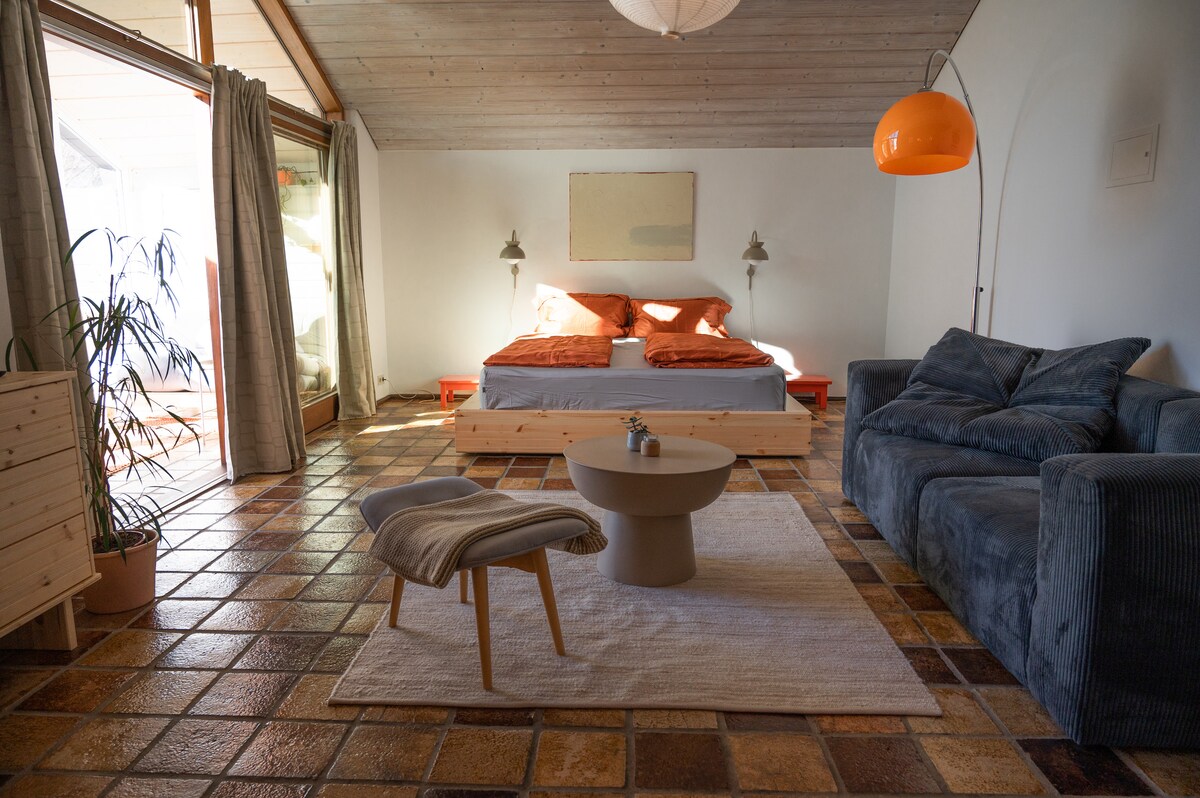 Estudio junto al lago Amplio estudio privado con terraza. A 4 minutos a pie del lago. El estudio fue diseñado intencionalmente para proporcionar un amplio espacio para el pensamiento, la reflexión y el movimiento. Suelos de roble en la sala de estar y azulejos con calefacción en el baño. Zona muy tranquila con vistas apacibles. Hay una terraza privada con vistas a un prado y al lago con un sendero que te lleva al lago. El baño tiene una bañera para dos y ducha separada.