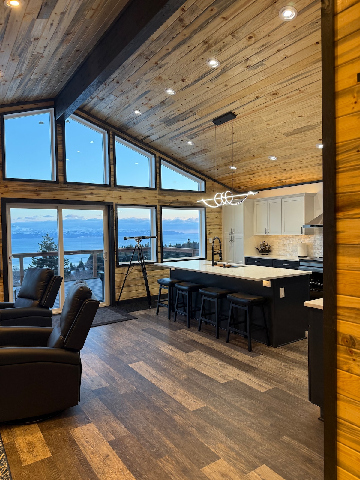 Apartamento nuevo en la planta superior. Relájate y disfruta de unas vistas increíbles en este alojamiento con estilo. Esta impresionante unidad de tamaño completo cuenta con 2 dormitorios. Una con una cama tamaño king y la otra con una cama tamaño queen, comparten un baño completo en el pasillo. Una cocina pequeña pero totalmente equipada con todo lo necesario, ¡incluidas las copas de vino! Un comedor y una sala de estar con un grupo de grandes ventanas que muestran las aguas de Homer Alaska. Esta unidad tiene una bañera de hidromasaje en la planta baja.