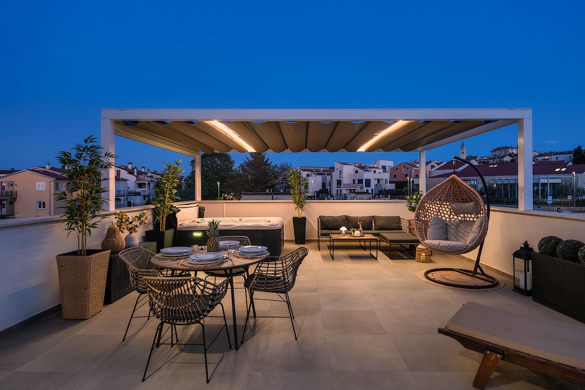 Costa Deluxe es un apartamento moderno para dos personas con jacuzzi en Funtana. El apartamento se encuentra en un edificio con otros dos alojamientos, cada unidad está completamente separada y tiene una entrada independiente, y los alojamientos se alquilan exclusivamente por separado. Costa Deluxe está ubicada en el primer piso y cuenta con una amplia terraza con jacuzzi, pérgola, muebles de jardín y tumbonas.